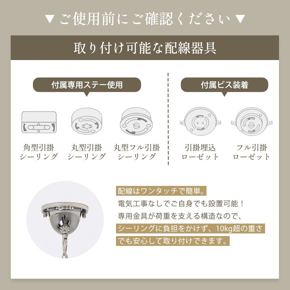 | 注意事項 | 新品・未使用品での販売ですが製造上での多少の小傷等はご了承願います 取り付けに関しましてはワンタッチでは御座いませんが(配線はワンタッチ)引掛けシーリングに対応しております、取り付け説明を参考に組み立て・結線して下さい、ご心配の場合は安全を期して最寄の電気工事店にご依頼をお勧めいたします また取り付け方等事前にお知りになりたい方はお気軽に質問コーナー又はfirst@kuk.ne.jpにお問い合わせお願い致します 調光が必要の場合、調光対応LED1個別途¥200-と汎用調光器が必要です 調光不可LED電球使用時、壁スイッチが調光スイッチ又はホタルスイッチの場合はLED不具合の原因になりますのでON/OFFのみのスイッチでご使用願います 店頭販売もしており重複した場合キャンセルさせていただく場合がございますがあらかじめご了承願います |