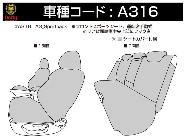 | 適合シート形状 | フロントスポーツシート、運転席手動式、リア背面6:4分割(センターアームレスト有)・座面一体式、フロントコンソールカバー付属 リア背面裏側中央上部にフック有 |