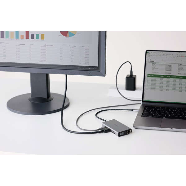 | USB (ダウンストリーム) | (1):USB Type-Cポート×1 ※充電専用USB Power Deliveryポート (2):USB-Aポート<USB 5Gbps(USB3.2(Gen1))>×2 ※映像出力非対応 (3):USB-Aポート<USB 480Mbps(USB2.0)>×1 |