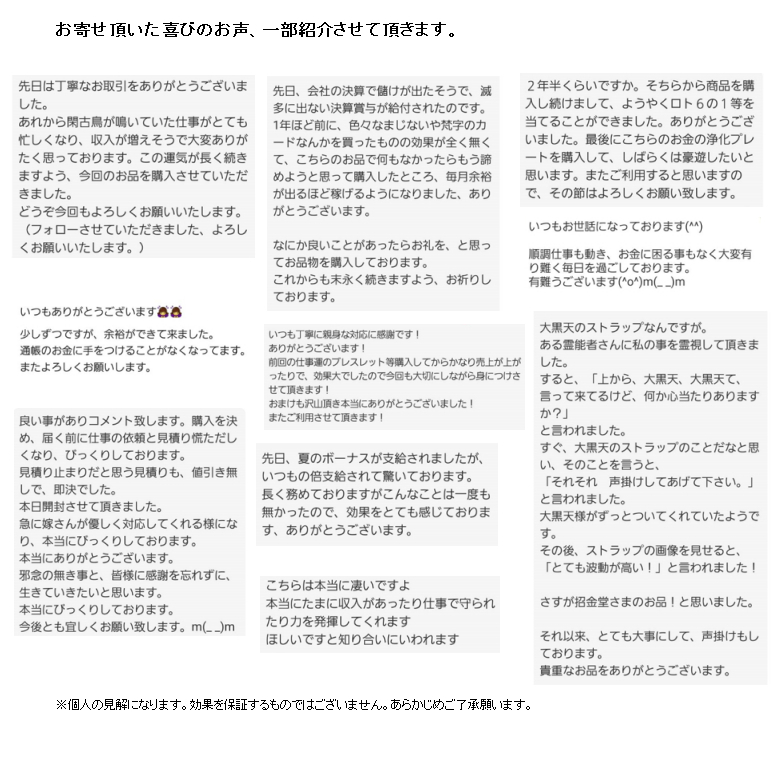 こちらの金運還元商品をご希望される場合、3,500円以上の商品購入後、『(こちらの金運還元商品名)お願いします』とメッセージお願いいたします。条件の確認がとれましたら、こちらの金運還元商品を0円で同梱いたします。