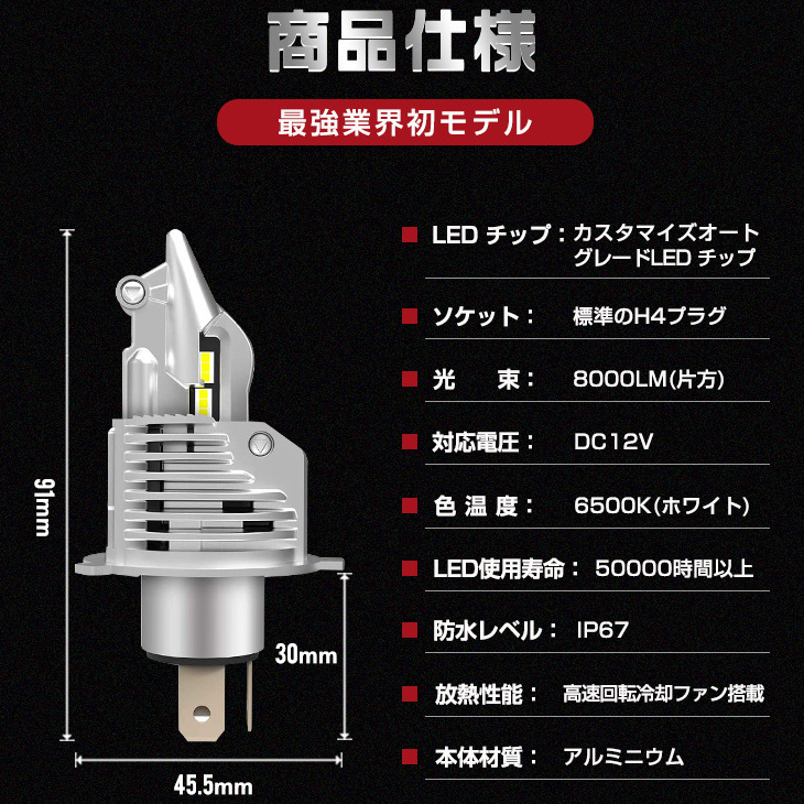 車検対応・純正配光・瞬間起動・高輝度・省電力・長寿命! ◆カスタマイズオートグレードLEDチップを搭載: カスタマイズオートグレードLEDチップ採用により、最大16000lmで、夜でも心配しなくて安全に運転できる! ◆純正配光: 純正のハロゲンとの同じ発光位置で、完璧な配光を実現!99%の車種に適応できます。 ◆一体型の設計: 一体型の設計で複雑なコネクタや配線一切なし、コネクタを差し込むだけ、簡単な取り付けは初心者でもオッケーです。 ◆二重放熱システム搭載: 高熱伝導性アルミニウム合金を採用で、高効率冷却ファン搭載し、10,000RPM/分で回転します。二重保護により、ランプを長寿命を保証します。 ◆IP67レベル防水防塵: 防水防塵により、雨水等を遮断、様々な天候に安全運転を確保します。 【保証】 ◆当商品は12っヶ月保証となります。 ◆お届けから1週間以内にご連絡のあった不良品の保証対応の送料は当方が負担いたします。 ◆保証期間内の不良品ですが、交換のみ対応しております。往復送料はお客様負担となります。在庫がない時だけ返金しますので、ご了承ください。 |