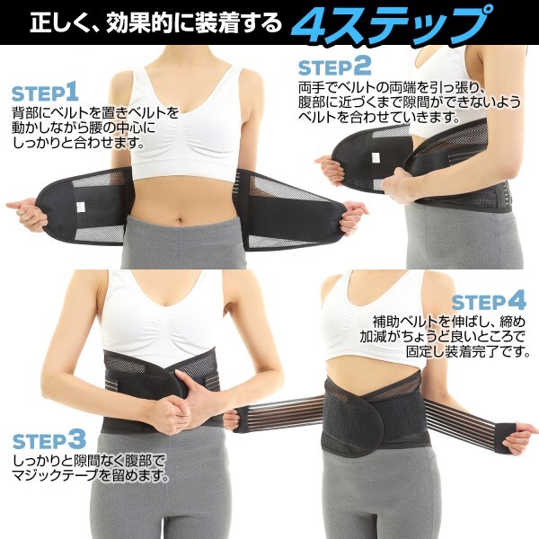 数あるオークションの中から、アクセス頂きありがとうございます。 【日常が変わる!毎日が笑顔になるオリジナルベルトはあなたの元気を取り戻します!】 ・丈夫なメッシュ素材で通気性、耐久性抜群! ・こちらはXLサイズのご案内になります。(豊富な8サイズを展開!) サイズ:XLサイズ 横:全長約110cm(腰周り:約86~95cmまで対応) 幅:約20.5cm 材質:ポリエステル65%・コットン35% カラー:ブラック (サイズ表も合わせてご覧くださいませ) ・Wベルトとマジックテープでしっかりホールド&加圧! ・医療用特殊樹脂ボーン採用だから驚きの軽さで、しっかりサポート! ・ボーンの本数が調節可能な為、ご自身の体調やご 使用環境に応じてホールド感の調整が可能です! 【こんな方にオススメです】 長時間のデスクワーク、立ち仕事、ヘルニアやぎっくり腰、 関節痛などの不安がある方、日常的に腰のサポートをしたい、 ウエストのシェイプアップなど、幅広く様々な方にご利用いただけます。 【特徴】 ・二段式ベルトの長さ、ボーンの間を日本人体型にリサイズしました。 ・ボーンが最大5本内蔵でき自由に取り出せるので5→4本など数を変えて 体調やご使用環境に応じてお使いになれます。 ・丈夫なメッシュ素材を採用しているので、通気性はもちろん耐久性にも優れています。 ・洗濯機で洗えるのでお手入れが楽! 【特典もついてくる】 ・オリジナル収納ポーチが付属! ・購入者だけの特典漫画で解説日本語説明書付き! ・100%安全保証!サイズ交換ももちろんOKです。 ※3Dボーンを装着しての激しい動きには向いておりません。ご注意願います。