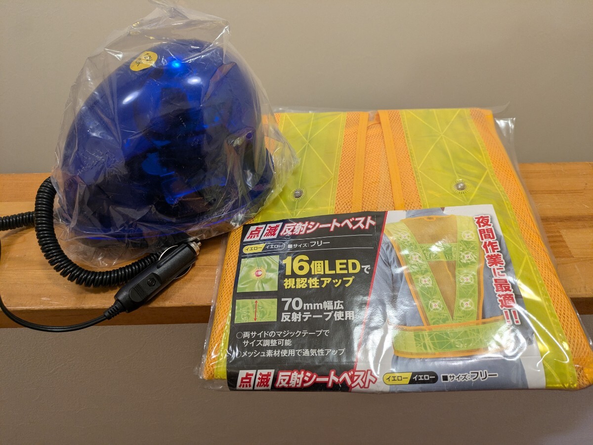 チェーン脱着等で路肩に停車する際の安全確保に便利なセットです。12Vのシガープラグ付回転灯とLED反射ベスト(単3乾電池2本別)になります。外袋に破れなどありますが本体は未使用です。3Nでお願いいたします。