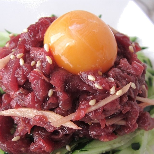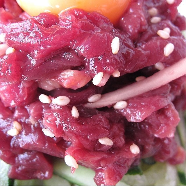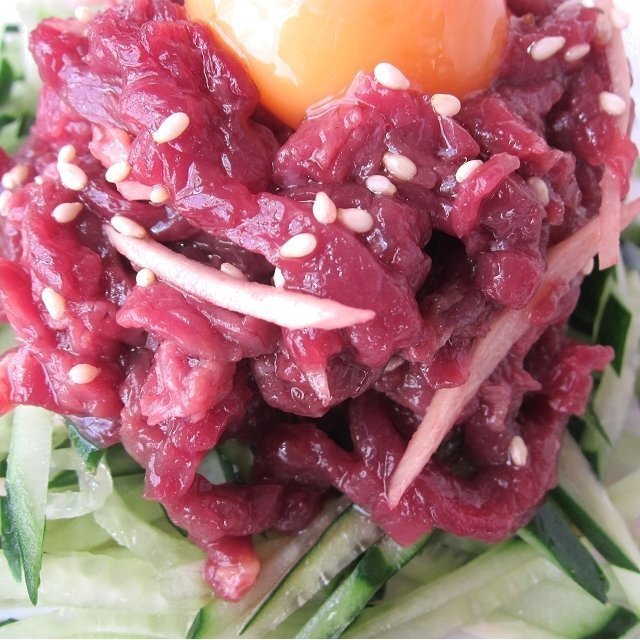 モモ、赤身肉を使用したユッケ、細切りの馬肉は甘辛いタレによく絡みます