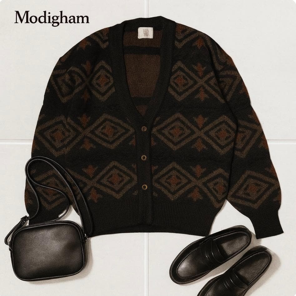 J1636@ 1スタ Modigham モディガム イタリヤ製 ニットカーディガン L ブラック 総柄 ジオメトリック