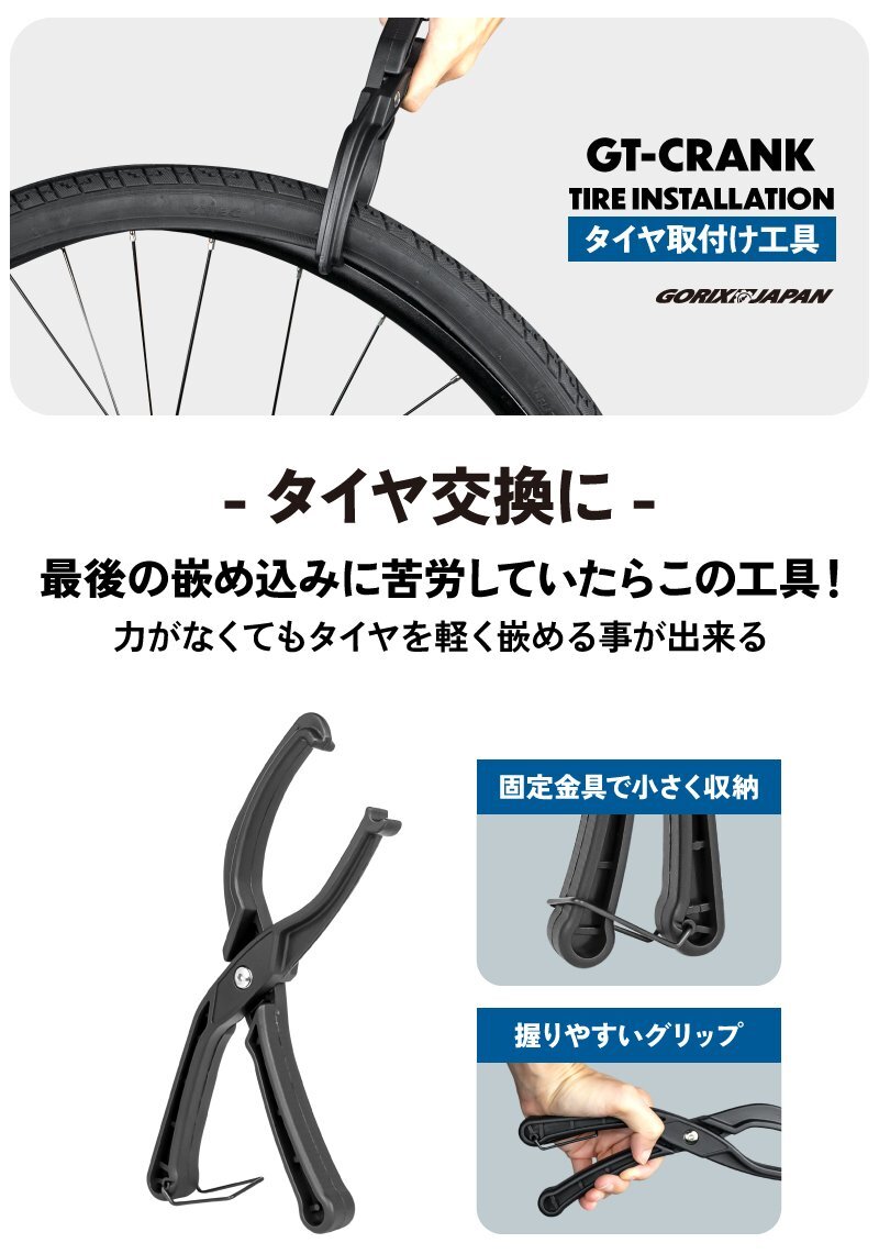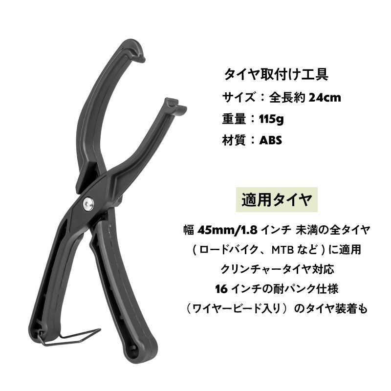 タイヤ交換の時に最後のタイヤはめ込みに苦労していた方や力ずくで手が痛い方におすすめの工具です。 タイヤの装着でしていた苦労もこの工具でなかった事に。これからは楽な作業に。 力を使わず簡単にリムに組み込める。 使い方は片側をリムに引っ掛けて反対側でタイヤを掴んでビードに引き寄せタイヤを嵌める。 自転車タイヤ取付け工具にはロック機能付き。収納しやすいロック機能で開きっぱなしにならなくて工具箱などにも収納しやすい。 また握りやすいグリップは凸凹が施してあり滑りにくくなっています。 自転車のタイヤ交換を楽にする工具です。 商品内容自転車タイヤ装着ツール サイズ全長約24cm 重量115g 材質ABS 適用タイヤ幅45mm/1.8インチ 未満の全タイヤ(ロードバイク、MTBなど)に適用。クリンチャータイヤ対応。 16インチの耐パンク仕様(ワイヤービード入り)のタイヤ装着も可能。 用途:自転車タイヤの交換、タイヤ装着 |