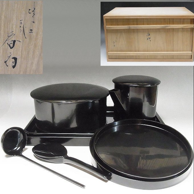 | 斉藤商店★美品 前端春斎 真塗 両次 飯器 湯桶 脇引盆 給仕盆 杓子 湯子★茶道具飯櫃丸盆長盆茶懐石 |