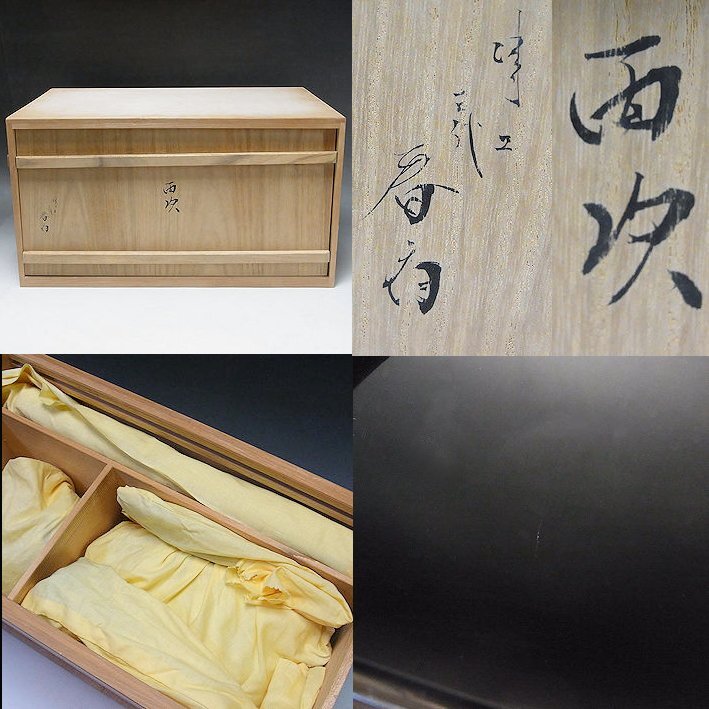 美品 前端春斎 真塗 両次 飯櫃 湯桶 丸盆 長盆 杓子 湯子でございます。 未使用、もしくは数回使用の良好な状態のお品です。 経年保管のお品ですので、保管に伴う経年変化はご理解ください。 盆の一部に僅かな線キズが見られます。(最後写真右下参考) お品寸約 飯櫃 径24.7cm 高11cm、湯桶 横25.5 高14.3cm、 丸盆(大) 径4.3 高2.5cm、丸盆(小)径22.8cm 高2.5cm、 長盆(大) 42.5×27.3×3cm、長盆(小)40.5×25.5×3cm、 杓子 23.5cm、湯子 25.3cm、 共箱でございます。 お品は保証させていただきますので、レブリカや贋作の類だった場合や 説明と違う状態だった場合は返品はもちろん、送料や振込み手数料を当店で 負担させていただきます。 どうぞ宜しくお願い致します。 ※出品者の齊藤商店は創業75年の美術商です。ホームページは【こちら】をご覧ください。(外部サイト) 他にもいろいろと出品しておりますので下記バナーをご覧下さいませ。 ![]() |