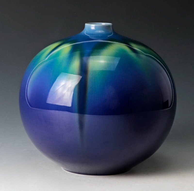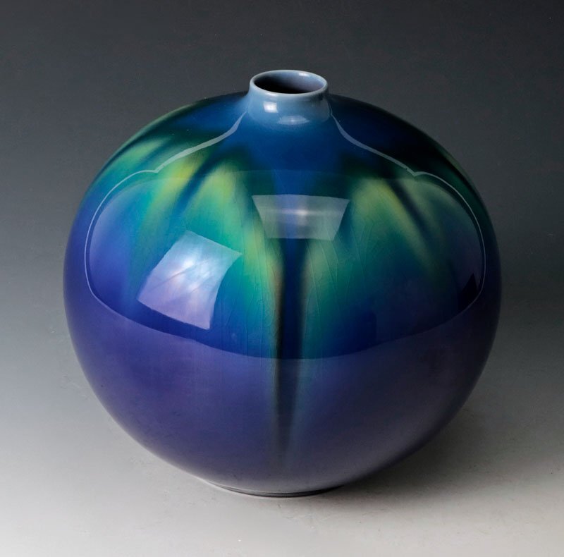 【三代徳田八十吉】 昭和8年(1953年)、小松生まれ。祖父の徳田八十吉に師事し、九谷焼上絵釉を研究。父の二代徳田八十吉につき現代陶芸を学び、新しい九谷焼の表現を追求してきた。青手古九谷の研究から得た、釉薬により器全体を塗り埋める手法を展開させ、その美しさを現代に生かす工夫を重ね、段階的に色彩を変化させる独特の技法は高く評価されている。昭和33年、第1回一水会陶芸部展に初入選。昭和38年、第1回朝日陶芸展及び新日展に初入選。日展には第11回日展まで連続して入選。以後日本伝統工芸展に転じ、昭和46年、18回展で初入選、NHK会長賞。昭和52年、24回展で日本工芸会総裁賞、昭和61年、第33回展で保持者選賞を受賞。平成9年(1997年)、彩釉磁器で重要無形文化財保持者に認定される。 |