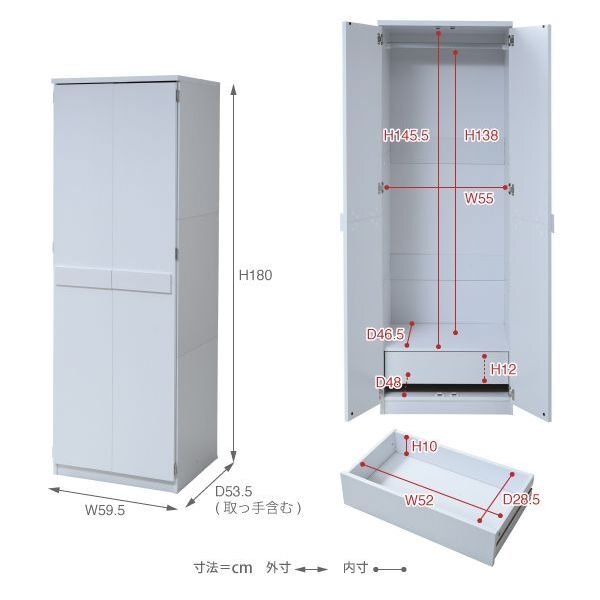 【カラー】 ダークブラウン、ホワイト 【サイズ】 <外寸> 幅59.5×奥行53.5×高さ180cm <内寸> 扉内:幅55×奥行48×高さ145.5cm ハンガーバー:幅54.5×高さ138cm 引き出し:幅52×奥行28.5×高さ10(有効12)cm 【材質】 本体:プリント紙化粧合板 【耐荷重】 ハンガーバー:(約)12kg以下 固定棚:(約)15kg以下 引き出し:(約)5kg以下 【ハンガーバー収納量】 衣類:(約)10~18着 【生産国】 ベトナム 【梱包】2梱包でお届けします。 2-1 サイズ:67×60×15cm、重量:22.4kg 2-2 サイズ:93×55×12cm、重量:17.4kg 【その他】 六角レンチ同梱 【組み立て品】 お客様による組み立てが必要です。 【ご注意】 ・サイズ、重量は概算です。 ・商品カラーはご使用のモニターによって実際の明るさや色と異なって見える場合がございます。 |