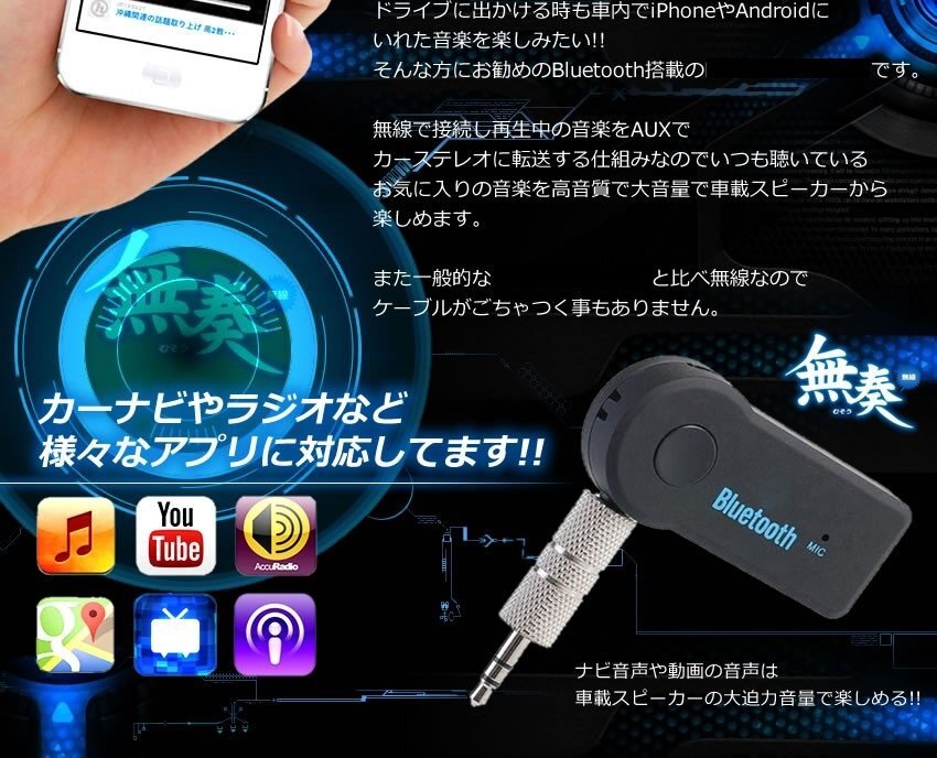 スマホの音楽を無線で簡単に楽しもう。 高品質無線レシーバー「 無奏 」が登場!!! 音楽機器のイヤホンジャックに挿してペアリング!! ドライブに出かける時も車内でiPhoneやAndroidにいれた音楽を楽しみたい!! 無線で接続し、再生中の音楽をAUXでカーステレオに転送する仕組みなので また一般的なレシーバーやトランスミッターと比べ無線なので ※日本語説明書は付属しておりません。 ※輸入品につき、若干の傷や汚れはご容赦くださいませ。 |