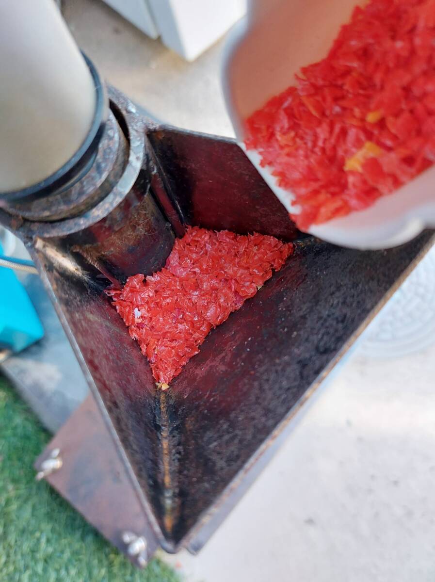 自動射出成型機の開口部にシュレッダーされたペットボトルのキャップを注ぎ込み、コントローラーの赤ボタンを押すとコースターの型へ溶かしたプラスチックが流れ込みます。流し込んだ後、コントローラーの緑ボタンを押すと注入が終わり、コースターが出来上がります。