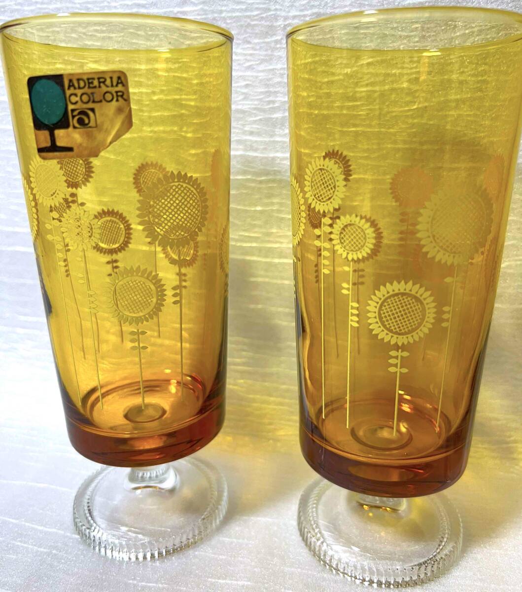| ☆レトロ&アンティーク☆保管品☆ADERIA COLOR☆アデリアガラス☆アンバーガラス☆琥珀色☆ヒマワリ模様☆脚付きグラス☆一式セット |