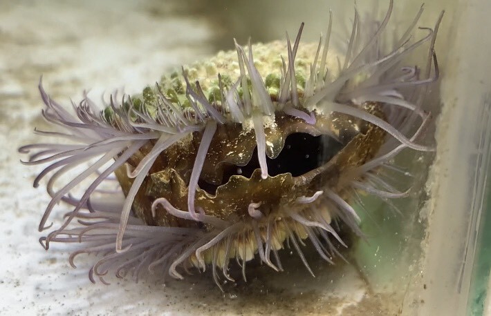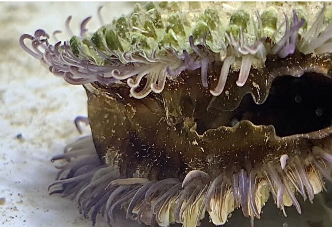 ホタテのようにジャンプして移動し、ライブロックの隙間等、居心地の良い場所を見つけると足糸を伸ばして体を固定します