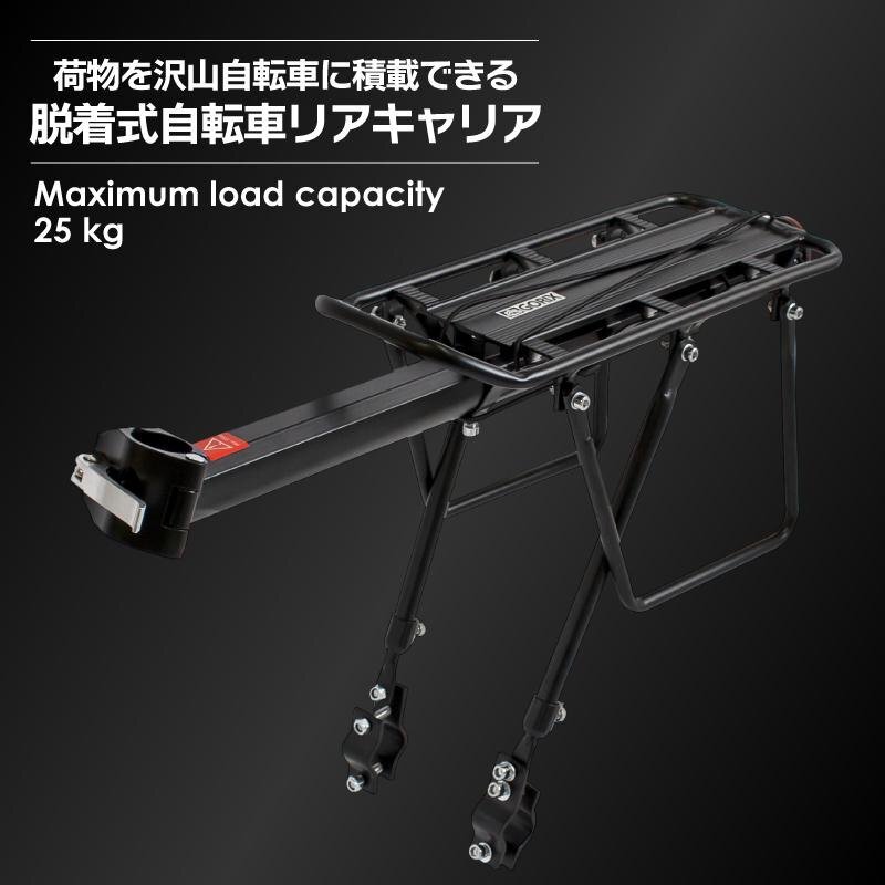 自転車荷台、自転車用リアキャリアを取付ける事により荷物を沢山自転車に積載できるようになります。 キャリアを付ける事で背中に汗を掻いて不快な思いをしたり、長時間背負い体に負担を掛ける事も無くなります。 通勤・通学やツーリング、旅行、お買物に最適なリアキャリアです。 スポーツ自転車やコンパクト自転車に! [様々な自転車に対応] 自転車のシートポストとステーに固定るので様々な自転車に対応します。 700cロードバイクやクロスバイク、マウンテンバイク、折り畳み自転車等ほとんどの自転車タイプに適用。 [軽量で頑丈] 軽量で強度、耐食性に優れたアルミを素材に採用。 塗装はアノダイズド塗装を採用。 プレート部分には錆びに強く、雨の日も安心。 泥除けにもなり泥や水の跳ね上がりを気にしなくていい。 [超耐荷重] 最大耐荷重は25キロまで可能。 3点で支える事で安定し、重さを分散します。 ツーリング途中のお買物で急に荷物が増えても安心。 [簡単取付け] 着脱はとても簡単、そしてスピーディ。 シートポストへの取付けはクイックリリースレバーで速やかに行えます。 必要な工具はすべて付属しています。 [可動式] 荷台は可動式となっているので柔軟に調整できます。 サイドの方形スタンドを利用してパニアバッグを取付ける事も可能です。 [反射板付き] 荷台の後ろに反射板(リフレクター)を取付ける事で安全が無いより向上。 後からの追突リスクを軽減。 商品内容自転車用リアキャリア・日本語説明書 本体サイズ(約)53×14cm 材質アルミニウム合金 最大耐荷約25kg 組立と取付方法説明書内容ご参照ください。 カラーブラック ※ジャンク品の為、キズ、汚れ等ある場合がございます。正常に動作しない、付属品が足りない、修理が必要な場合等ある場合がございます。ノークレーム、ノーリターン | |
