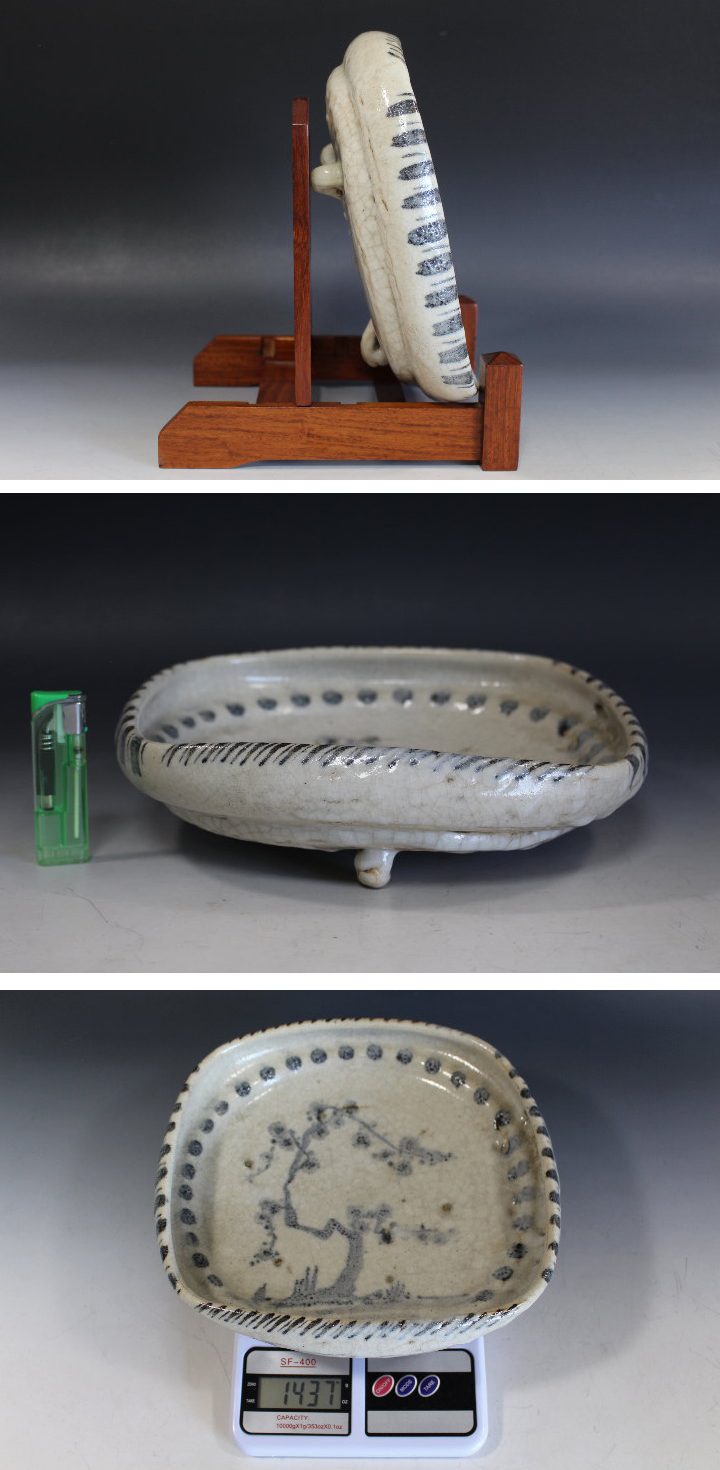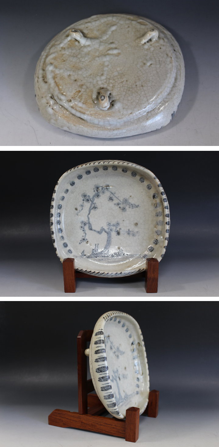 サイズ:高7.0cm 25.0×24.3cm 古い志野鉢です。 内側へ折り返した口縁を方形にした懐石料理用の鉢。 菓子鉢として。 参考に! 「鼠志野草花文鉢」京都国立博物館所蔵 重要文化財 「鼠志野草文鉢」京都国立博物館所蔵 「鼠志野鶺鴒文鉢」東京国立博物館所蔵 重要文化財 「鼠志野鉢」五島美術館所蔵 残念ですが、箱は失われありません。 皿立ては商品に含まれません。 写真をご覧の上ご入札宜しくお願い致します。 | |