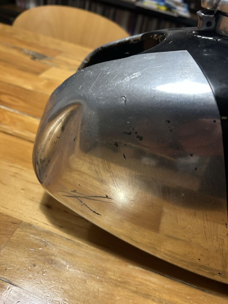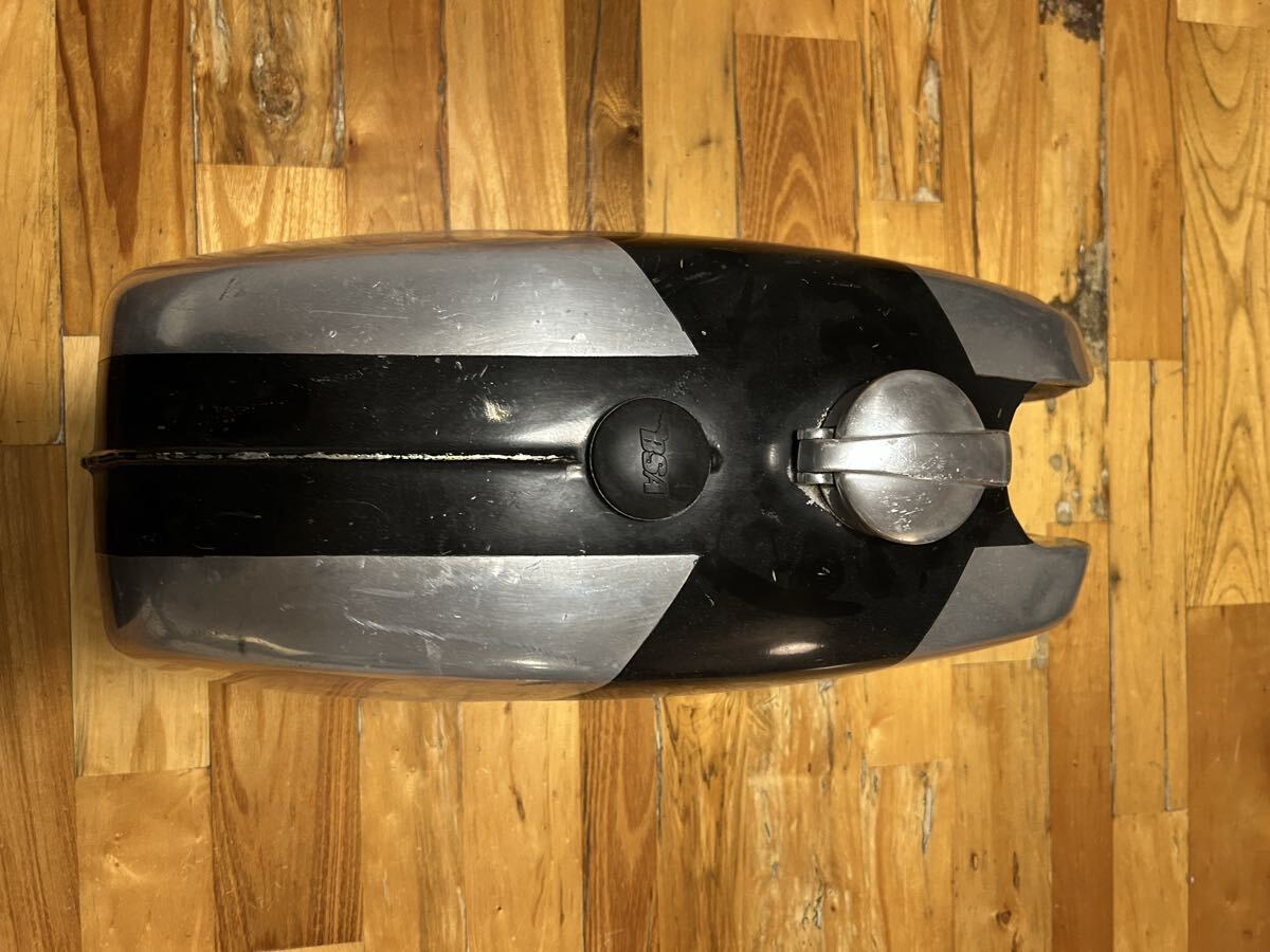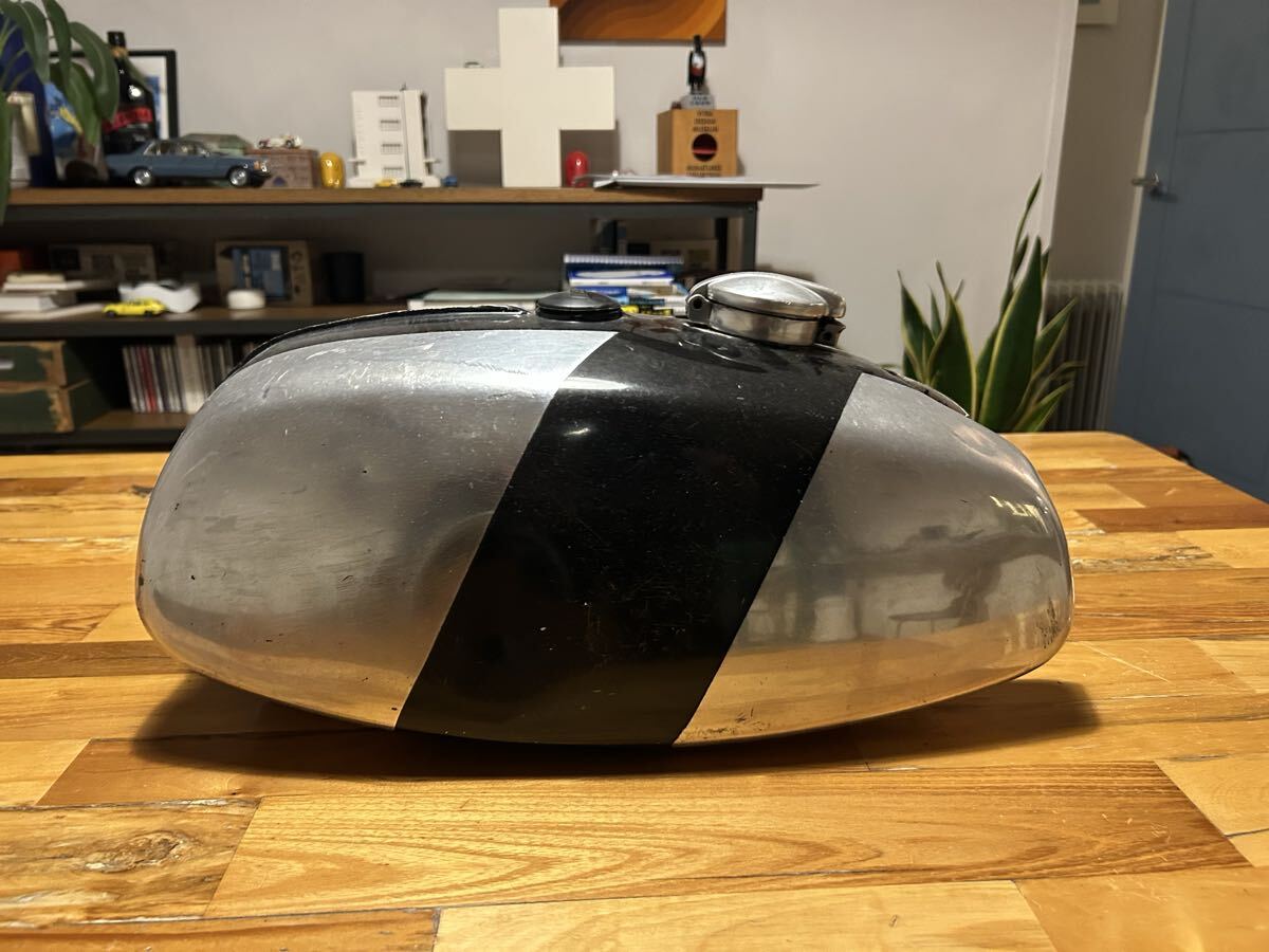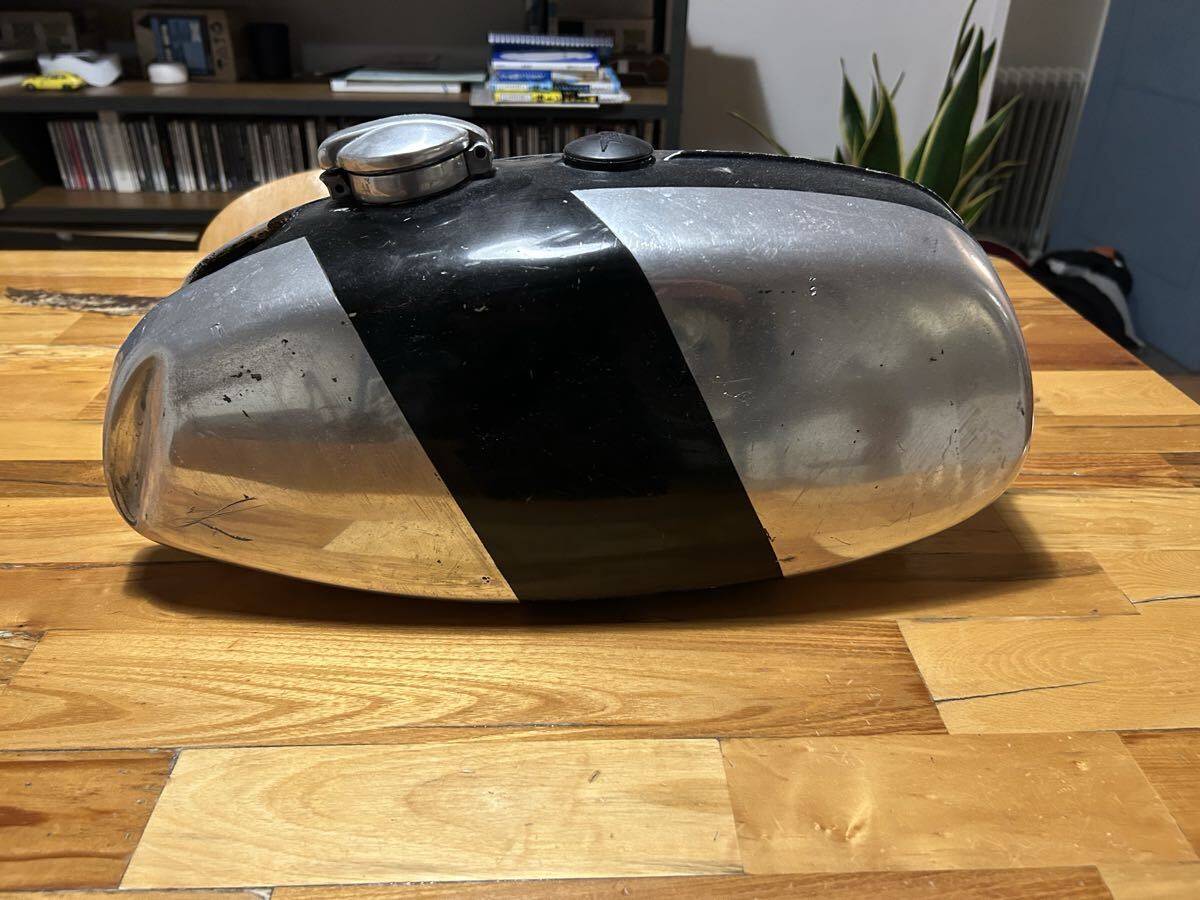 BSA B50MX アルミタンク 純正 以前に海外から取り寄せたBSA B50MXのアルミタンクです。写真にもあるように先端部分に1箇所凹みあります。ノークレームノーリターン厳守