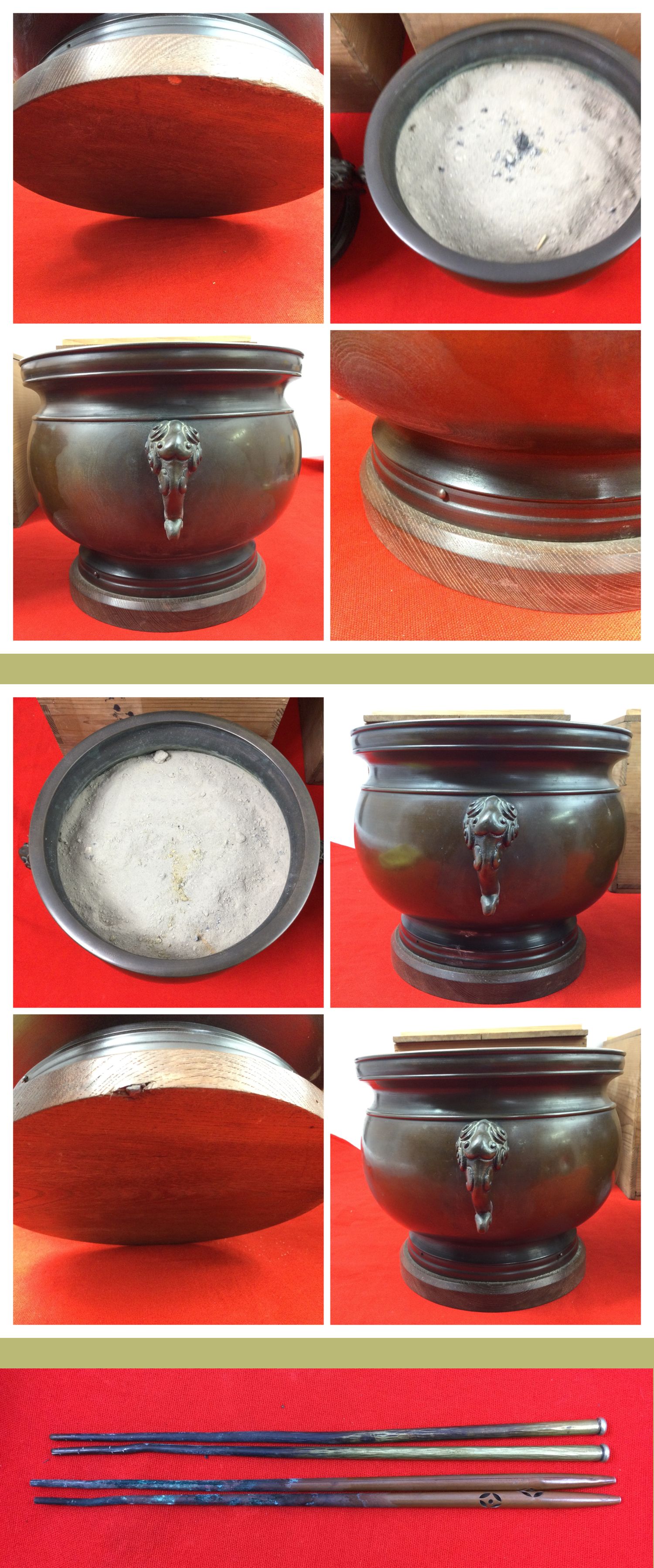 閲覧ありがとうございます♪ 宣徳銅製 象の双耳 火鉢 一対(2点・灰入り)の出品です。 本品は箱書より「宣徳銅 火鉢 金屋 五郎三郎」 と記されたもので、同作・同形の象耳火鉢が一対揃った希少品です。 左右の耳部は象をかたどった象耳意匠となっており、 立体的で力強い造形は、宣徳銅火鉢の中でも特に人気の高い意匠です。 落ち着いた銅肌と相まって、時代火鉢として格調の高い佇まいを備えております。 本品は木製台座が火鉢本体に固定された構造となっています。 設えた際の安定感があり、当初よりこの形で用いられてきたものと考えられます。 内部には灰が入った状態で、実用火鉢です。 火箸も付属し、揃い物として大変魅力のある内容です。 【サイズ(約)】 (1点あたり) 口径:約 22.5cm 最大直径:約 25.6cm 高さ:約 21.5cm 重量:約 5.9~6.5kg(※灰入りの状態) 火箸/長さ:約 25~25.5cm/金属製(詳細不明 ※素人採寸につき、多少の誤差はご容赦ください。 【状態】 一対2点ともに経年によるスレ・小キズ・くすみあり 内部は灰入り(現状渡し) 火箸はサビ汚れ有 1枚目の画像の左側の火鉢側面に小さな凹み(画像6枚目参照)ございますが、その他は目立つ凹みや割れは見受けられません 共箱は時代相応の汚れ・スレあり ※一対物につき、経年によるわずかな個体差はご了承ください。 ※状態は写真を優先してご判断ください。 |