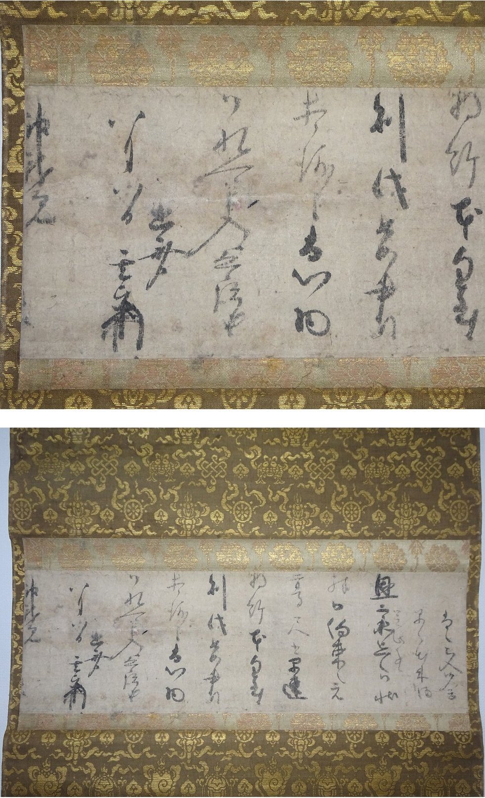 紙本 漆塗撥軸 真筆保証(真作) 金襴三段表装風帯つき ウブ幅 箱書きあり 中身寸法14×44 少し時代等あり 幅自体しっかりしています ※古筆学研究所認定調書つき ※極あり よろしくお願い致します