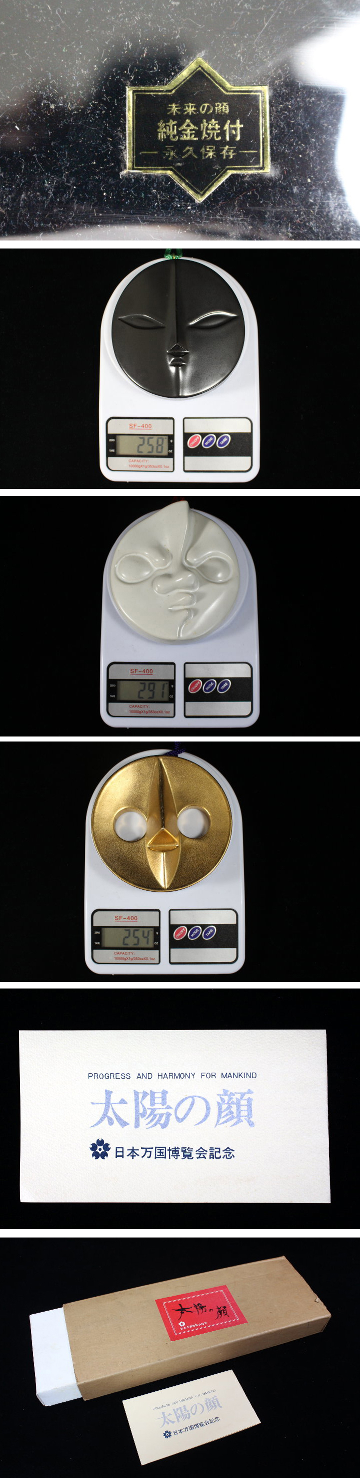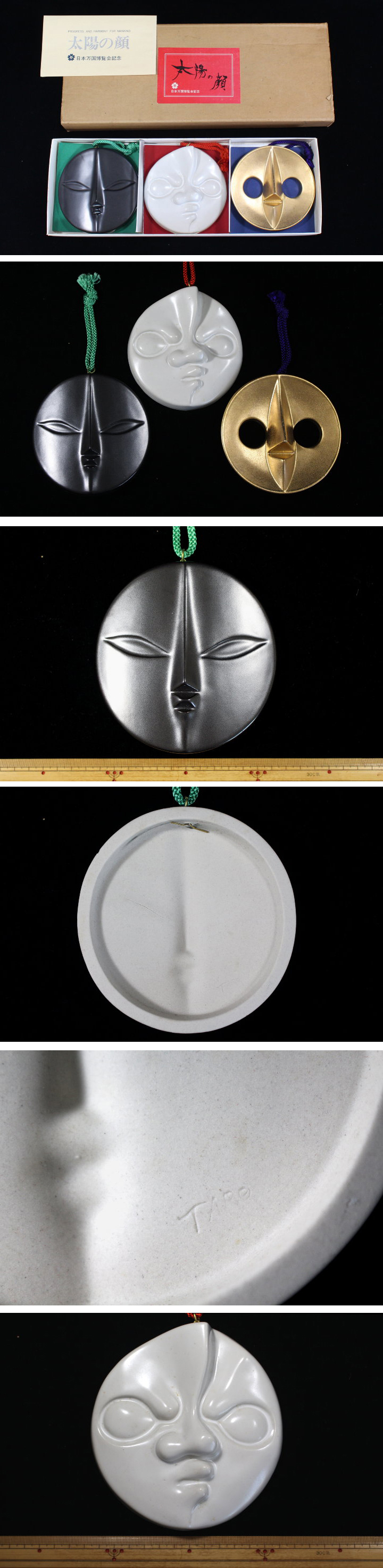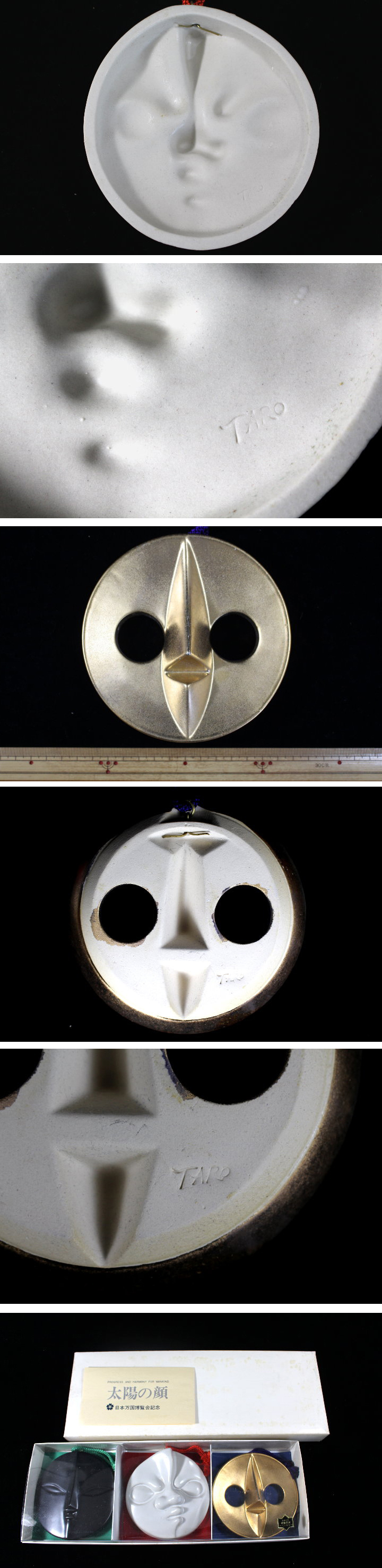 サイズ:径 約13.5cm 岡本太郎氏の陶製レリーフ 3点 紙箱入です。 EXPO'70 日本万国博覧会記念 太陽の顔「現在・過去・未来」3点です。 アクリルカバーに擦れなどの傷み・傷があります。 中箱に汚れ、段ボール外箱にも汚れ・ヤケ・傷みがあります。 外箱サイズ:41.8×16.0×5.0cm 写真をご覧の上ご入札宜しくお願い致します。 | |