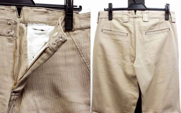 ・サイズ S (76)cm ・ウエスト(実寸)78cm わたり幅29cm 前股上24.5cm 裾幅22.5cm 股下79cm ・ストレートシルエットのコットン(綿)パンツ、新品、裾ジーンズカット仕立てです。 ・素材 綿60%ポリエステル37%ポリウレタン3% ・お色はブラウンとベージュの中間色。ステッチはこげ茶です。 ・ひと模様約5mm幅のへリンボン織りが入っております。 ・前立てはフック&ボタンで脱ぎ着になっております。 ・後ろ中心にはV字スリットが入っております。 ・夏にはやや地厚ですので、秋口~春先向けの3シーズン対応になります。