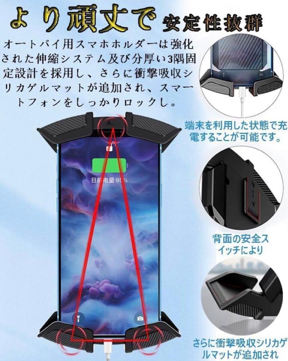 オートバイ用スマホホルダーは強化された伸縮システム及び分厚い3隅固定設計を採用し、さらに衝撃吸収シリカゲルマットが追加され、スマートフォンをしっかりロックし。一般のスマホホルダーよりさらに安定しているだけでなく、スマートフォンもしっかりロックし、ご大切な携帯電話を落下によるダメー。高速ライディング時や悪路でもスマホが落ちる心配はありません。