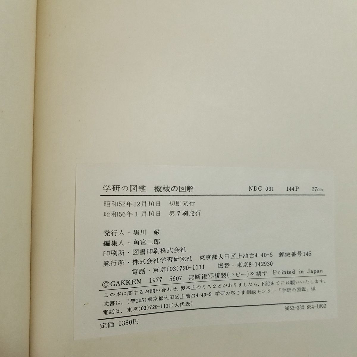 学研の図鑑 【機械の図解】 著者:--- 出版社:学研 発行年:1981年1月10日 第7刷 商品の状態:並下。使用感、経年変化、折れ、汚れ等がある。 (焼けあり / 折れ少々 / 汚れ少々 / ヨレ少々 / ページ割れあり) 付属品: 備考: 経年によるページの変色があります。 ケースに多少のキズや汚れがあります。 ページ割れが複数個所あります。 様々な分野、様々な機能、様々なサイズの機械の断面図が掲載された図鑑。 その数、実に60種。 カメラやエスカレーターなどの一般的なものから、てんぷらうどん自動調理販売機やチョコレート、キャラメル、食パン等の工場機械等の意外なものまで、かなり多岐にわたります。 いかんせん発行年が古いため最新の機械とは行きませんが、そのアナログ感が逆に新鮮であり、楽しめると思います。 #図鑑 #学研の図鑑 #クロスセクション #断面図 当商品は中古品です。 状態については、写真もよく参考にしてください。 商品の状態についてできる限り確認・記載しておりますが、見落としがあった場合はなにとぞご容赦ください。 |