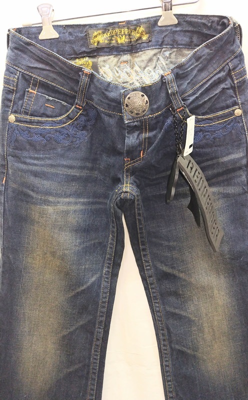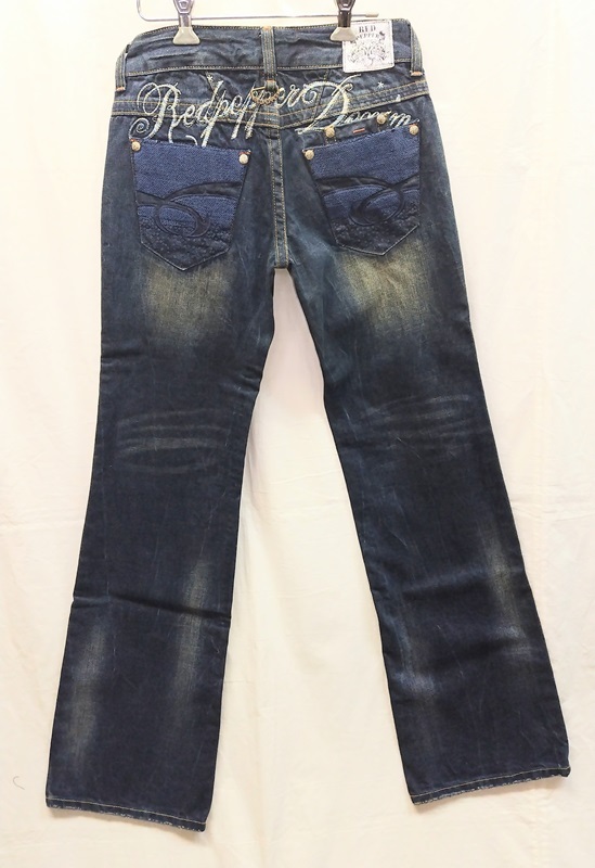 REDPEPPER:レディースジーンズです。新品 W28 韓国製 綿:100% (W28)表示の平置き実寸ですウエスト:79cm 又上:18cm 又下:87cm 裾幅:25cm ワタリ:27cmレッドペッパージャパンの商品です。前後に刺繍入りで豪華です。裾がやや広がっています。股上は浅いです!定価¥17380です水曜日は定休日ですので、連絡、発送等の取引業務は