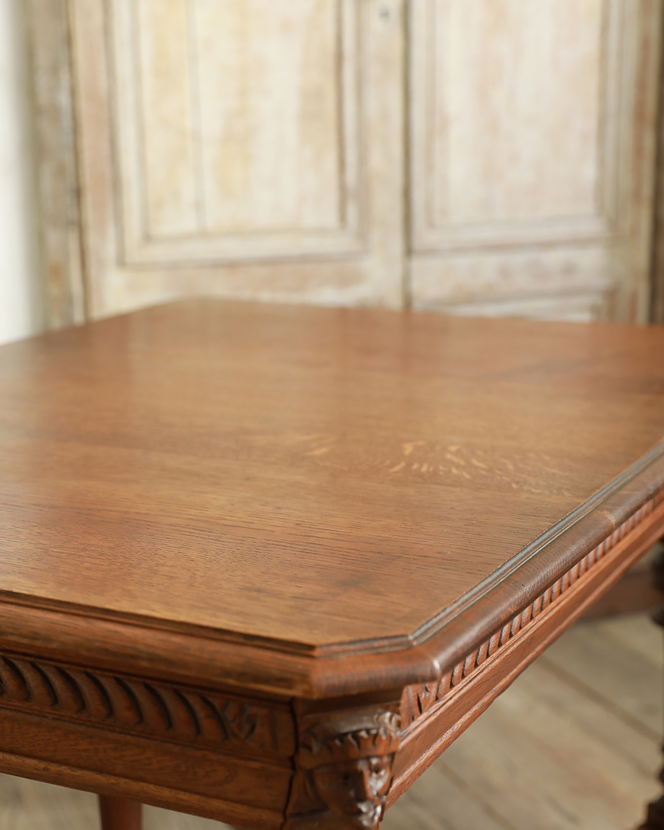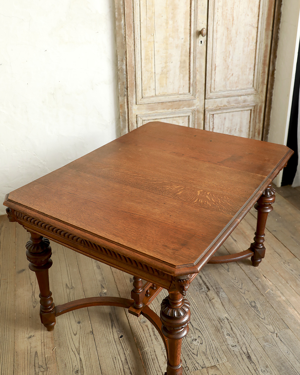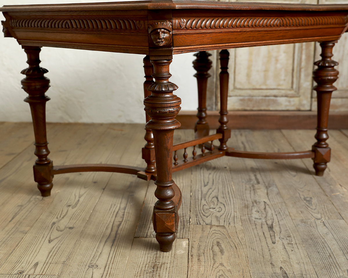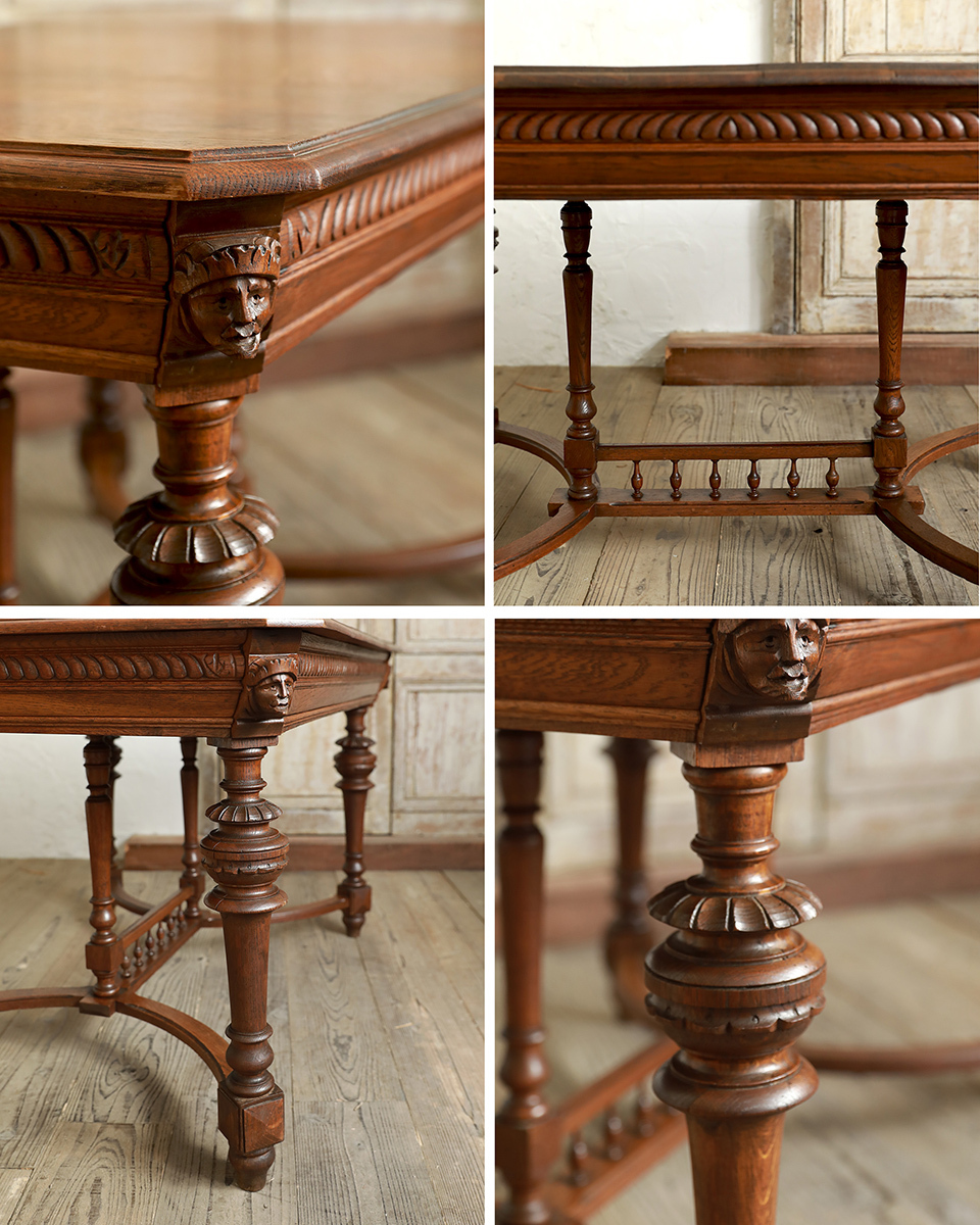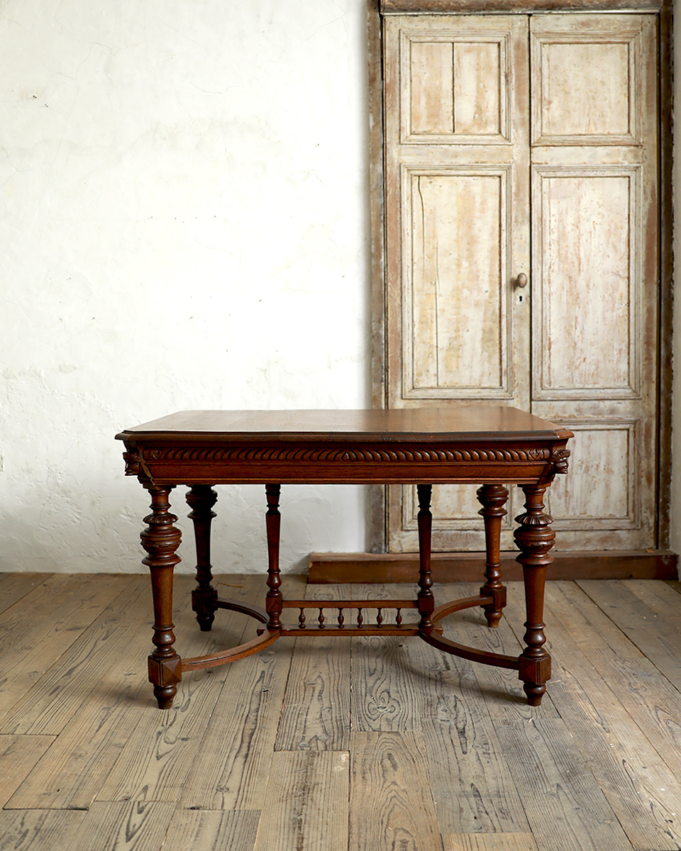 From : France 格式高い華やかな装飾が惜しみなく配われたフランスならではの伝統と優美を受け継いだクラシカルな風貌のダイニングテーブルです。 格別な存在感を引き立てるのは、脚元のアーチを描いたストレッチャー、それをつなぐ豪華な装飾ではないでしょうか。 アンリ2世様式の特徴でもある小さな支柱が連なったデザインは非常に繊細な造りで至極の拘りを伺わせます。またオクタゴン (八角形)の天板を支える幕板にも重厚な装いの彫刻が彫り出され威厳を際立たせます。 何気ないシーンでも画になる、洗練されたインテリアをスタイリングいただけ、瞬く間に上質な空間を演出します。 ラグジュアリーな雰囲気を大切にされる飲食店 (レストラン)やアパレルショップ、サロンなどの演出にお勧めのひと品です。 商品はアンティーク品のため、お写真では伝わり難い色褪せや色むら、小傷や凹み傷、歪みや反りなどがございます。 追加のお写真をご希望の方はお気軽にお問合せくださいませ。 商品はメンテナンスを施してからの発送となります。 メンテナンス時にお写真にはない修復跡が残る可能性もございますので、予めご了承くださいませ。またお届けまでに7日間ほどお時間をいただく場合がございます。お急ぎの方はお気軽にご相談くださいませ。 |