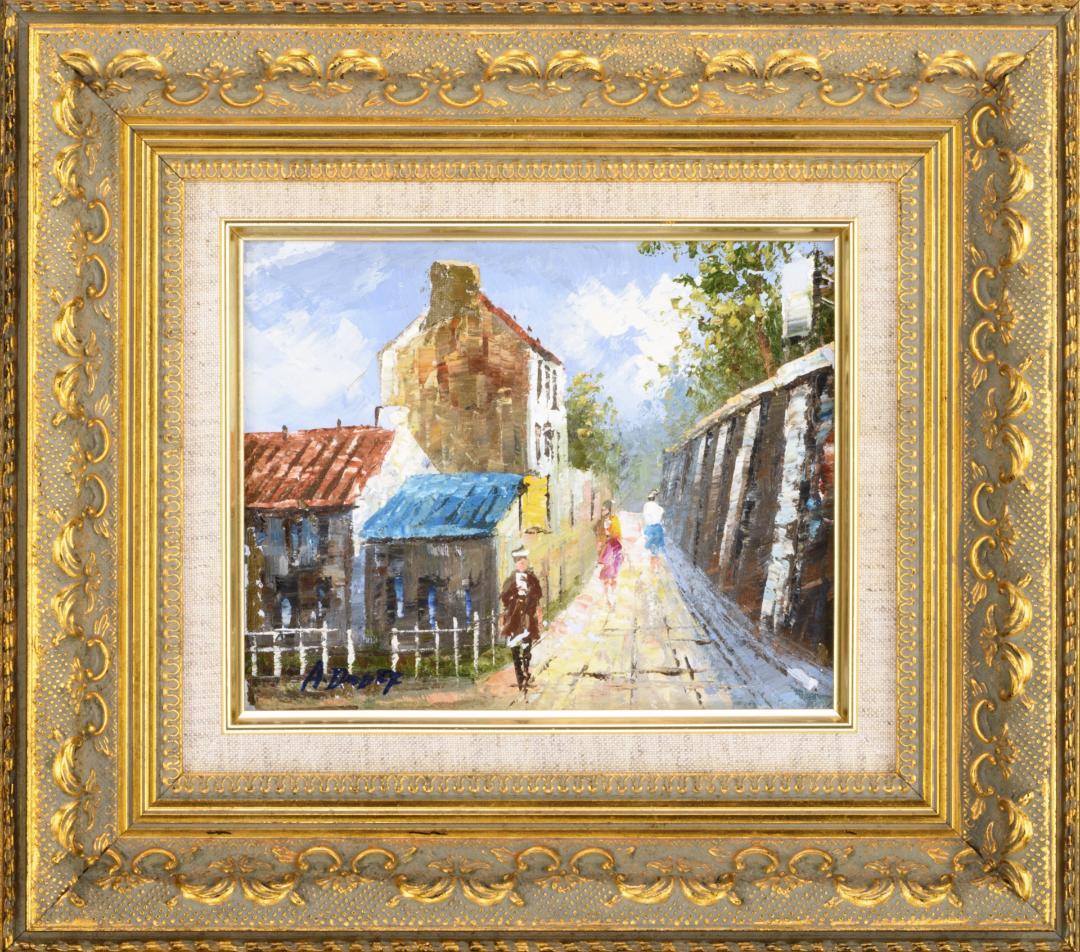 肉筆油彩画 『街角』 高級木製額縁付属 外寸約318×282mm