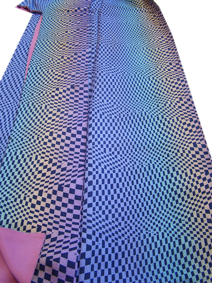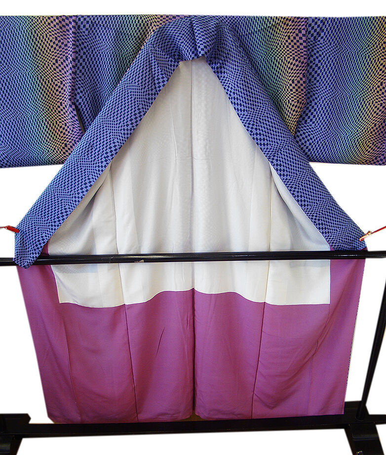 | 商品説明 | こちらのお品は「袷」ですので10月から5月までお召頂ければと思います。 しなやかで滑らかな手触りの着心地良い重めの極上ちりめん地の生地、 紫、黄、緑、青藤色のぼかし地に藍鉄色の角柄の染柄、 八掛は葡萄色(正絹)、身幅細め、幅広い年代の方にお召頂けます。 |