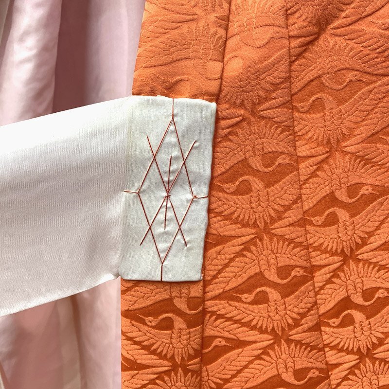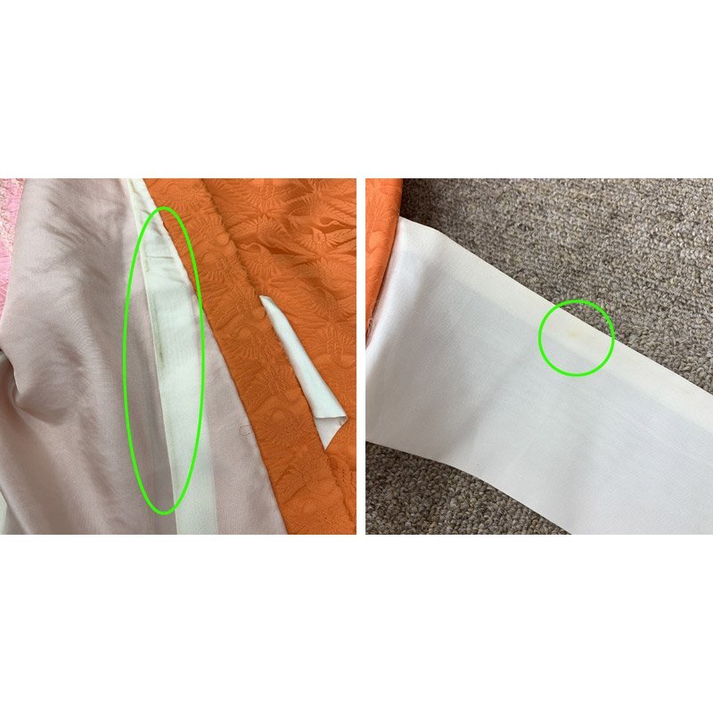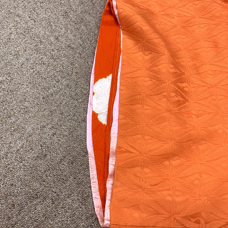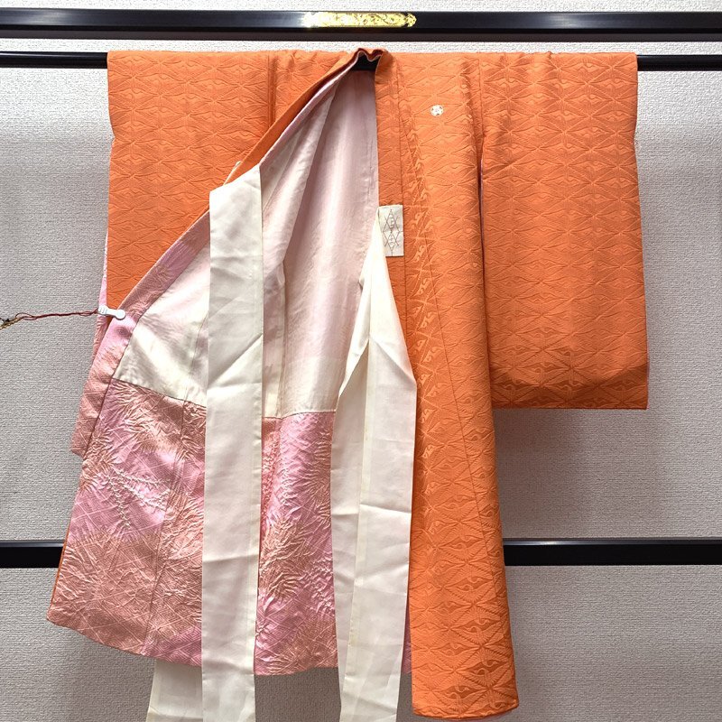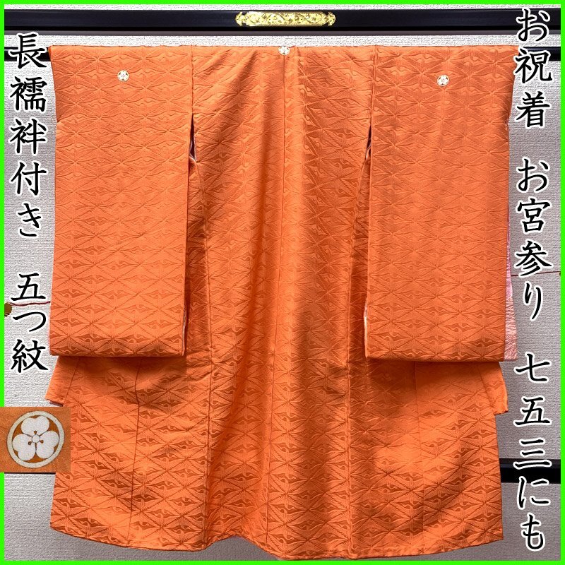 | ■お宮参り 女児 祝着 掛着 色無地 長襦袢付 五つ紋■美品 こちらの商品は掛け着と長襦袢のセットです。お宮参り用の女の子のお祝い着です。色無地で地紋の向かい鶴が浮き出て見え、豪華さを感じます。五つ紋の種類は「丸に片喰紋」です。 裏地にと付紐にシミがございますが、お着付けをすると隠れる部分です。 【素材】(着物)正絹 (長襦袢)正絹 【色】淡い朱色 *モニターによって色味は実際と異なる場合がございます。 【サイズ】(着物) 裄:43.7cm、袖丈:53.5cm、身丈(肩から):96.6cm *素人採寸のため、多少の誤差はご容赦ください。 お宮参りの掛け着としてはもちろん、七五三の3歳のお祝い着としては、お直しや被布と草履などのお小物類をご準備ください(肩上げ、腰上げは手縫いで簡単にできます) 。 | |