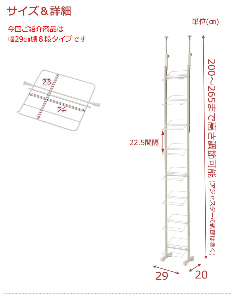 ■商品について/大人気の薄型設計で突っ張り式の機能的シューズラックシリーズにハイカット専用タイプが登場。玄関に溢れている靴をしっかり、且つ大量収納でき、玄関のデッドスペースを有効活用できるシューズラック。お気に入りの靴をおしゃれに飾ることで、毎日のお出かけが楽しくなること間違いなし!奥行が22.5cmと省スペース設計でデッドスペースに最適!更に12段あるので収納もしっかり!棚を斜めにすることで奥行をとらず、靴を取り出しやすく、見やすくおしゃれに収納できます。また、ワイヤー式なので靴べらや傘などをかけることができ、とても便利。低めの玄関框をまたいだ状態でも設置できるように微調整可能なアジャスターがついており、更に突っ張り式で安心。安全の日本製。幅29cm・53cm・75cm、幅29cmハイカット・幅53cmハイカットの5種類。玄関だけでなくお部屋にインテリアとしてもディスプレイ感覚でショップ風にキメる!| 出价者 | 信用 | 价格 | 时间 |