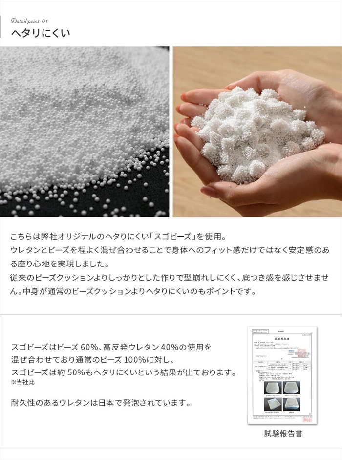 | [中材]発泡ポリスチレンビーズ、高弾性ウレタンフォーム [収縮する生地]ポリエステル88%・ポリウレタン12% [収縮しない生地]ポリエステル100%(カバーは洗濯可能) |