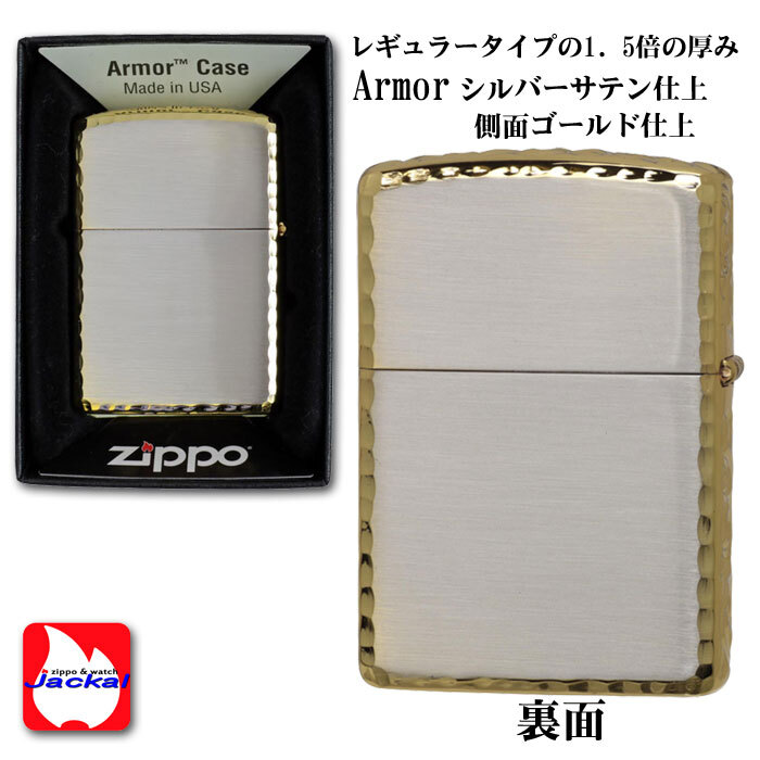 | ケースの厚みが1.5倍ある重量感たっぷ りのHEAVY WALL ARMOR! アーマージッポーは「鎧(よろい)」を意味するネーミングのとおり 通常のZIPPO(0.5mm)と比べ1.5倍程の厚み(0.75mm)があり、 重さも約70gとなり重厚さを増した。 アーマーモデルの底(ボトム部分)にはArmorの『A』のロゴ刻印があり、 従来のジッポとの違いを確認できる。 |