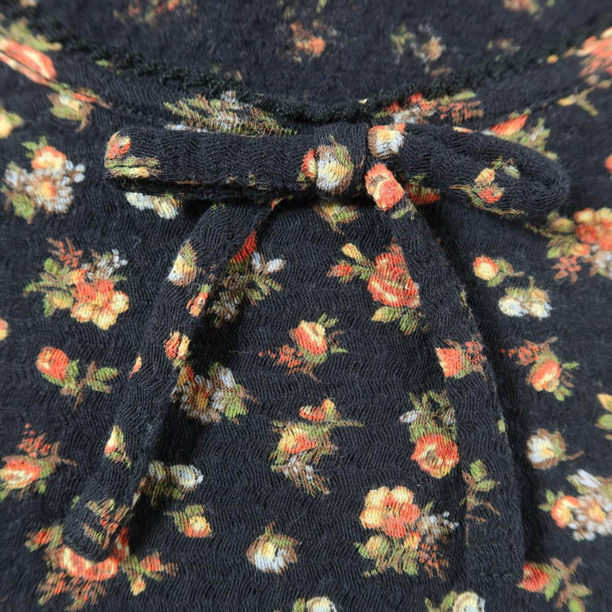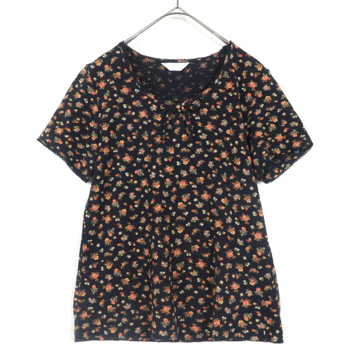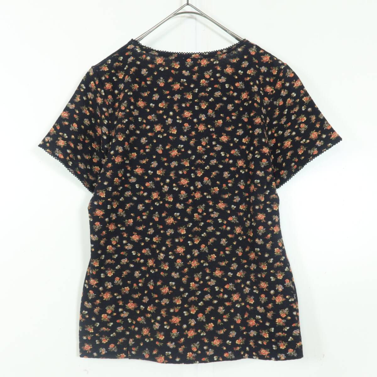 | 商品説明 | 【実寸約】肩幅70 袖丈16.5 バスト82 着丈50(cm) 【サイズ表記】M 【素材】綿100% 【状態】普通の使用感のあるお品物 【デザイン】黒系 少しシャリ感のある生地を使用した半袖カットソーです。 薄手(透け感少々あり)/花柄(バラの小花) |