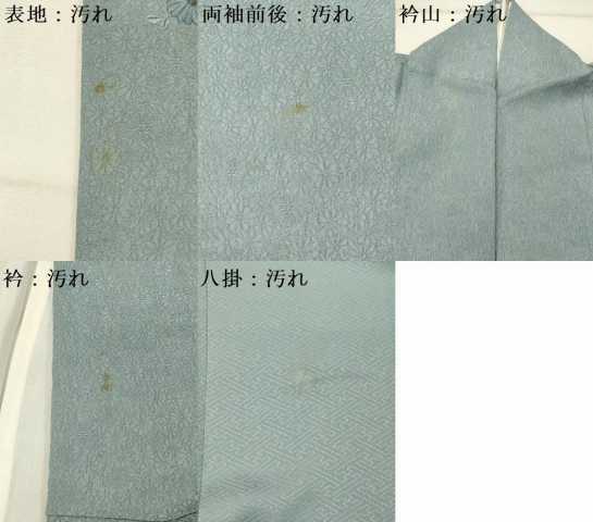 【正絹・一つ紋】 状態は画像を添付しておりますので、 そちらをご確認下さいますよう宜しくお願い致します。 大変上質な逸品になりますのでぜひお手入れをされてお召しになられてはいかがでしょうか。 お安く出品致しますので、是非この機会にいかがでしょうか? ※画像ではお色が出づらかったのですが、 タイトルにあります様に実際は和色大辞典の藍鼠色に近いお色かと思います。 ※表地の汚れは表地所々の薄い汚れがございます。 |