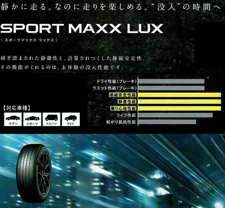 | 商品 | SPORT MAXX LUX スポーツマックス ラックス DUNLOP(ダンロップ) プレミアムスポーツタイヤ 4本セット品 商品説明 | ひとりになれる時間。音楽を楽しむ時間。アイデアに思考を巡らせる時間。このタイヤがくれるのは、静かな車内で、運転に没入できる時間です。 | タイヤの接地面積を増やし路面に効率的に伝達SPORT MAXX共通のプロファイルでタイヤの接地面積を広げるとともに接地面全てを活用することで操縦時の力を路面に効率的に伝達。 無駄なく落ち着いたハンドリングを実現小さな動きで狙い通りの操作が可能。 周期的な音の発生を低減するブロックと溝の配置を最適化し周期的な音の発生を低減するシームレスグルーブを採用。ブロック・溝が徐々に途切れず接地するので抜き足のようなイメージになり音の発生を低減。 空気の流れを乱すことで音圧を下げる溝内部にスロープを配置し、空気の流れを乱すことで音圧を下げるデュアルスロープを採用。 注意事項 | 必タイヤサイズをご確認下さい | その他 | こちらの商品はお取り寄せになります。○■メーカーお取り寄せ商品発送の目安■取寄2~4営業日出荷(メーカー品切時相談)まれに欠品中の商品もありますので、お急ぎのお客様はご注文前に必ず納期をお問い合わせ下さい。ヤマト運輸代引(コレクト現金支払い)も可能です。銀行振込の場合はご入金確認後の発送となります。※休業日の発送はございません。沖縄県+離島の場合は1本に付き¥4,000別途送料がかかります。 | |