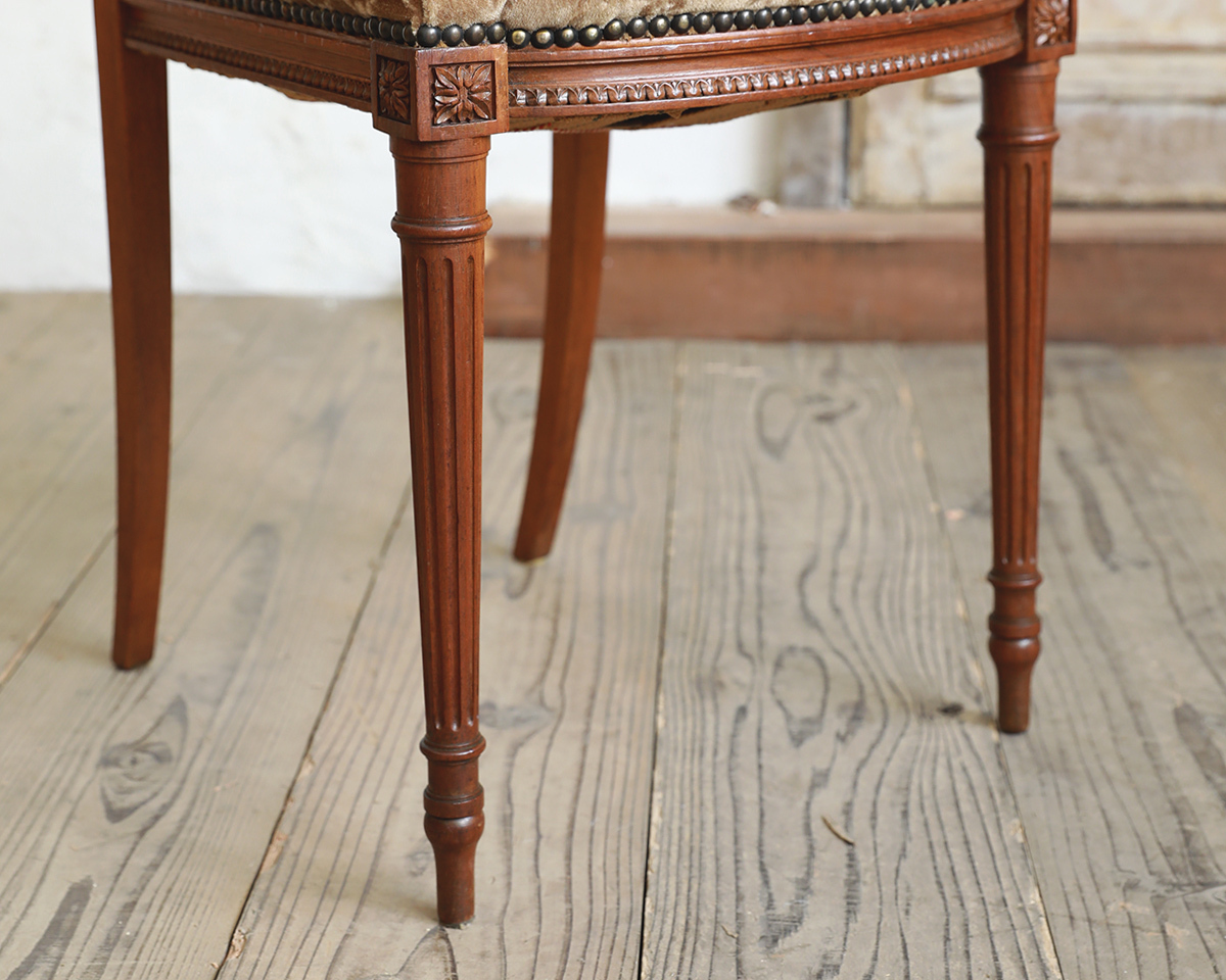From : France (1880s) フランスアンティークらしい繊細な装飾が美しいルイ16世様式のサロンチェア。 優雅な曲線を描くフレームに配われた立体的なリボンモチーフの彫刻や、その小口にまで彫り込まれた美しい植物やパネルの彫刻にクオリティーの高さを伺えます。また背もたれの支柱や脚にはフルーティングと呼ばれるストライプ状の彫刻が施され、ルイ16世様式らしい気高さと格式高い雰囲気を纏ったひと品。 座面のダイヤ柄のファブリックが端正な佇まいのフレームと相性が良く、類稀なる存在感で高級感をいっそう引き立てます。 同じデザインで状態違いのものが4脚ございます。 座面のファブリックは入荷時の状態となります。 現状でもご使用いただける範囲ではございますが、古いもののためファブリックにシミ汚れや押し跡、解れなどが見受けられます。 また内部のクッションに多少のへたりがございます。 生地の張り替えをご希望される方は別途有料(8,000円~)にて承ります。詳細につきましてはお気軽にお問合せくださいませ。 商品はアンティーク品のため、お写真では伝わり難い色褪せや小傷などがございます。追加のお写真をご希望の方はお気軽にお問合せくださいませ。 商品はメンテナンスを施してからの発送となりますので、お届けまでに7日間ほどお時間をいただく場合がございます。 お急ぎの方はお気軽にご相談くださいませ。 |