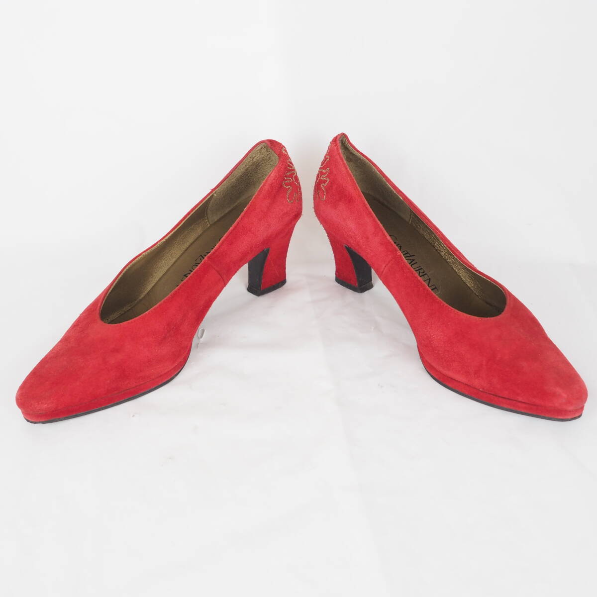 | ページをご覧いただきありがとうございます^^靴、ブーツを中心に出品しております。 上品なレッドスエード調が目を引く高級感あるデザイン。 ヒール部分にゴールド刺繍が施されたエレガントな一足。 華やかな席やパーティーコーデにおすすめ。 YSLらしい美しいシルエットで脚長効果も◎ ☆商品詳細☆