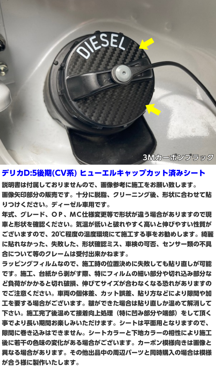 ※カーボンホワイト、ギャラクシーブラックは廃盤の為お選び頂く事ができなくなりました。 3M製以外は別ページで販売中です。 ※ご連絡なくお支払が終わっている場合はカーボンブラックにて発送させていただきます。 ③車両専用ラッピングシート ラッピングシートは剥がす際に糊残りがしにくく、貼り付けに失敗した場合でも 貼り直しが可能です。 当店では、雨、紫外線、風埃、熱等の環境が過酷な自動車には車両専用のシートをご使用される事を推奨しております。 ◆商品詳細◆ ★商品名:デリカD:5CV系後期