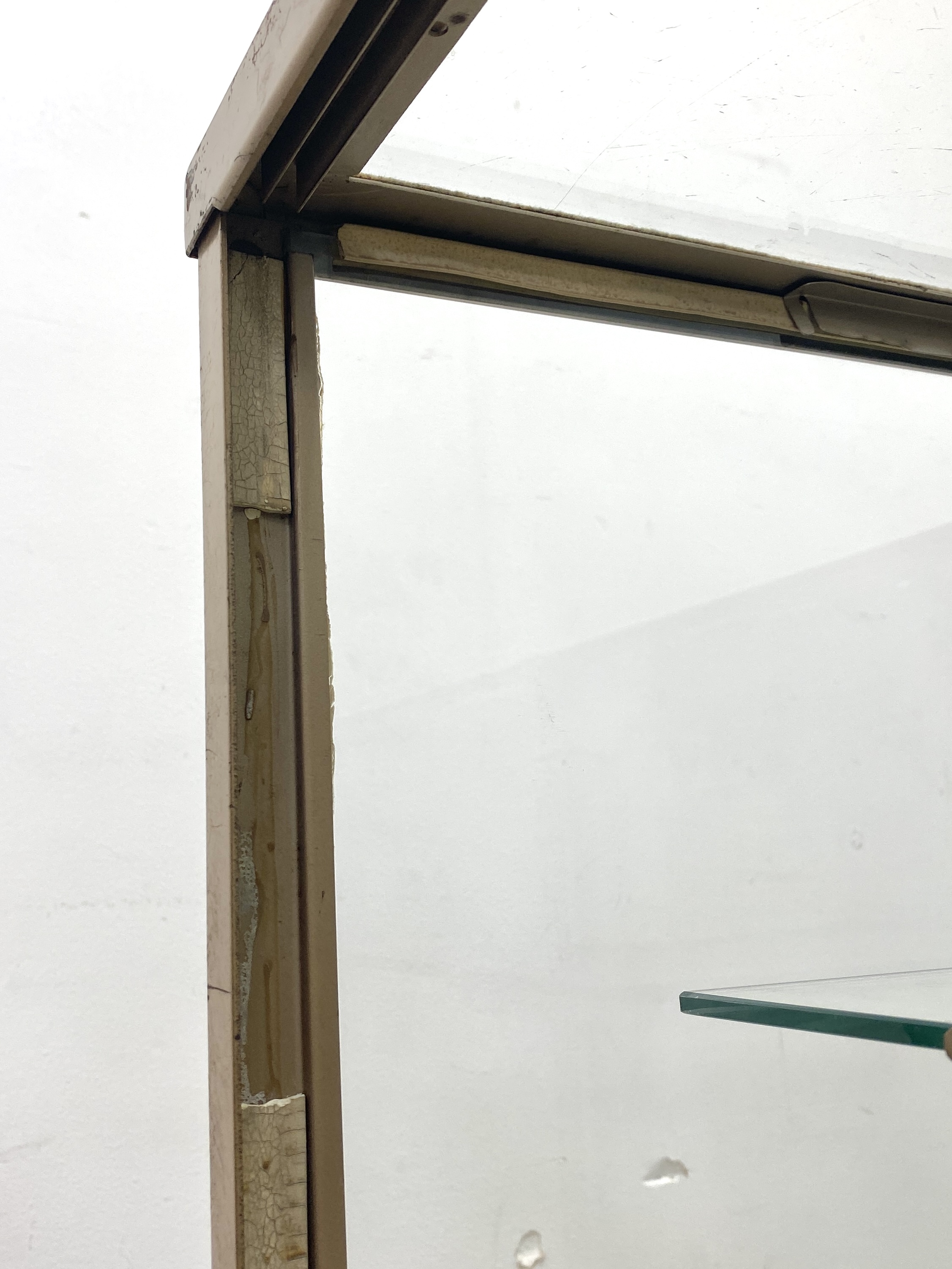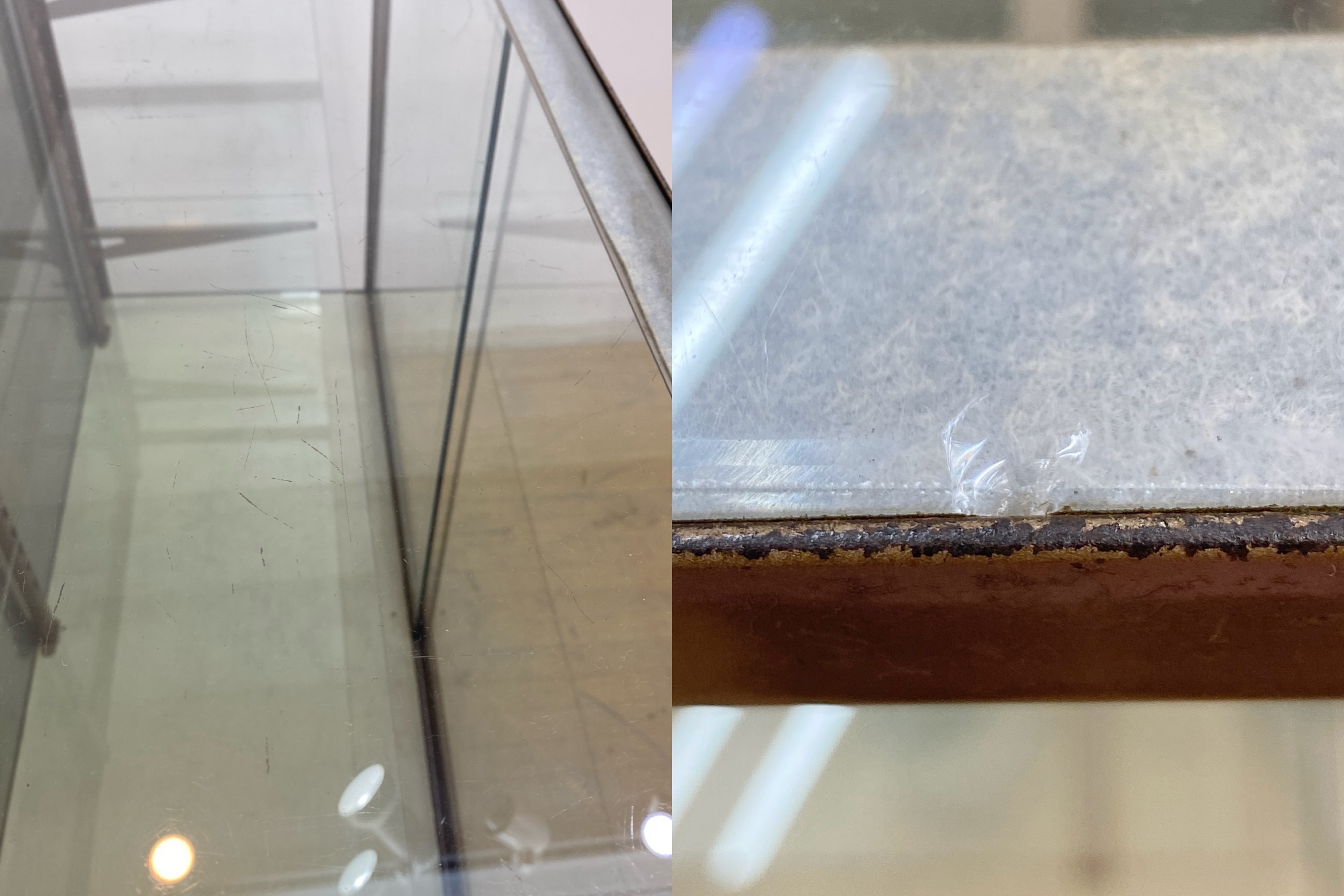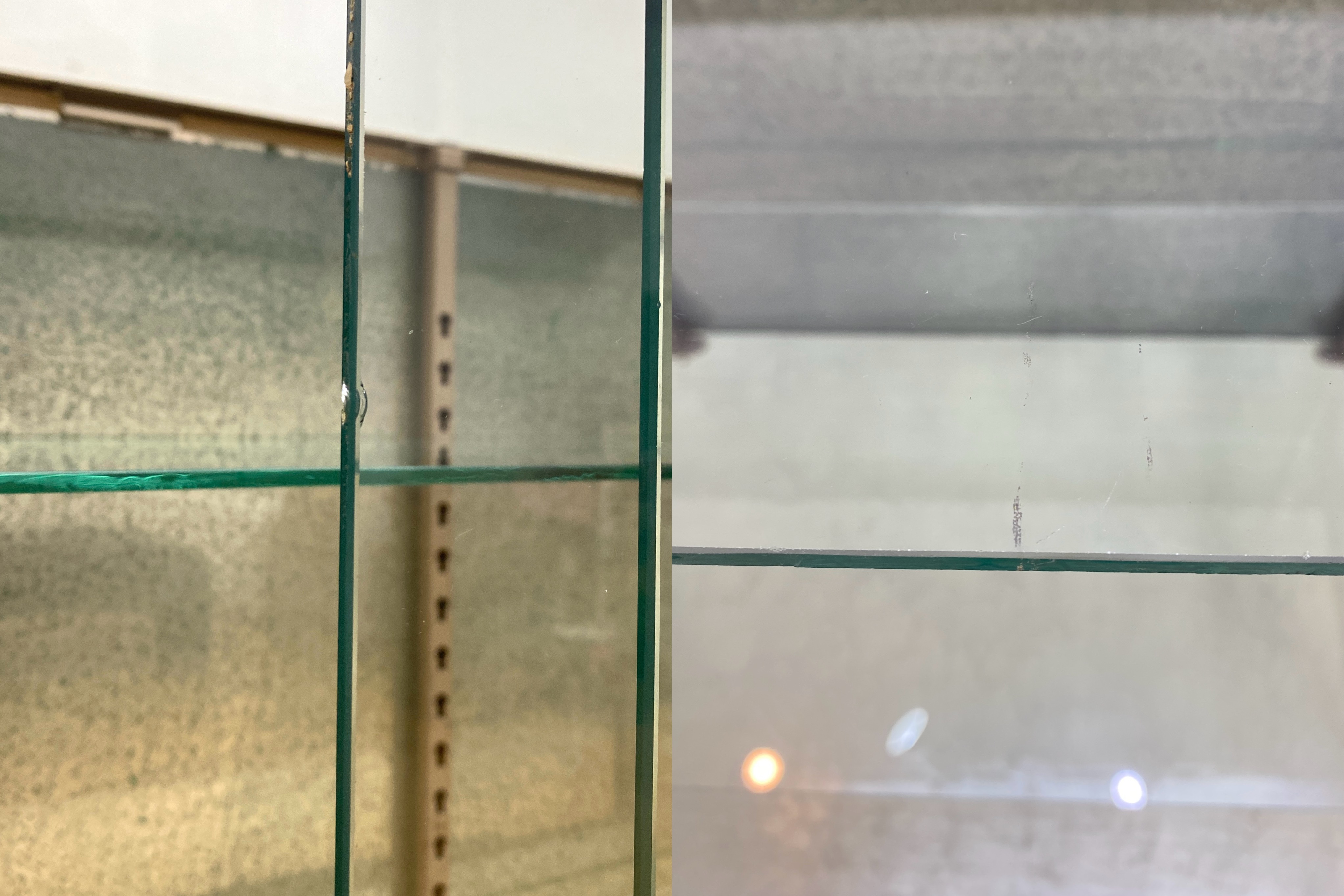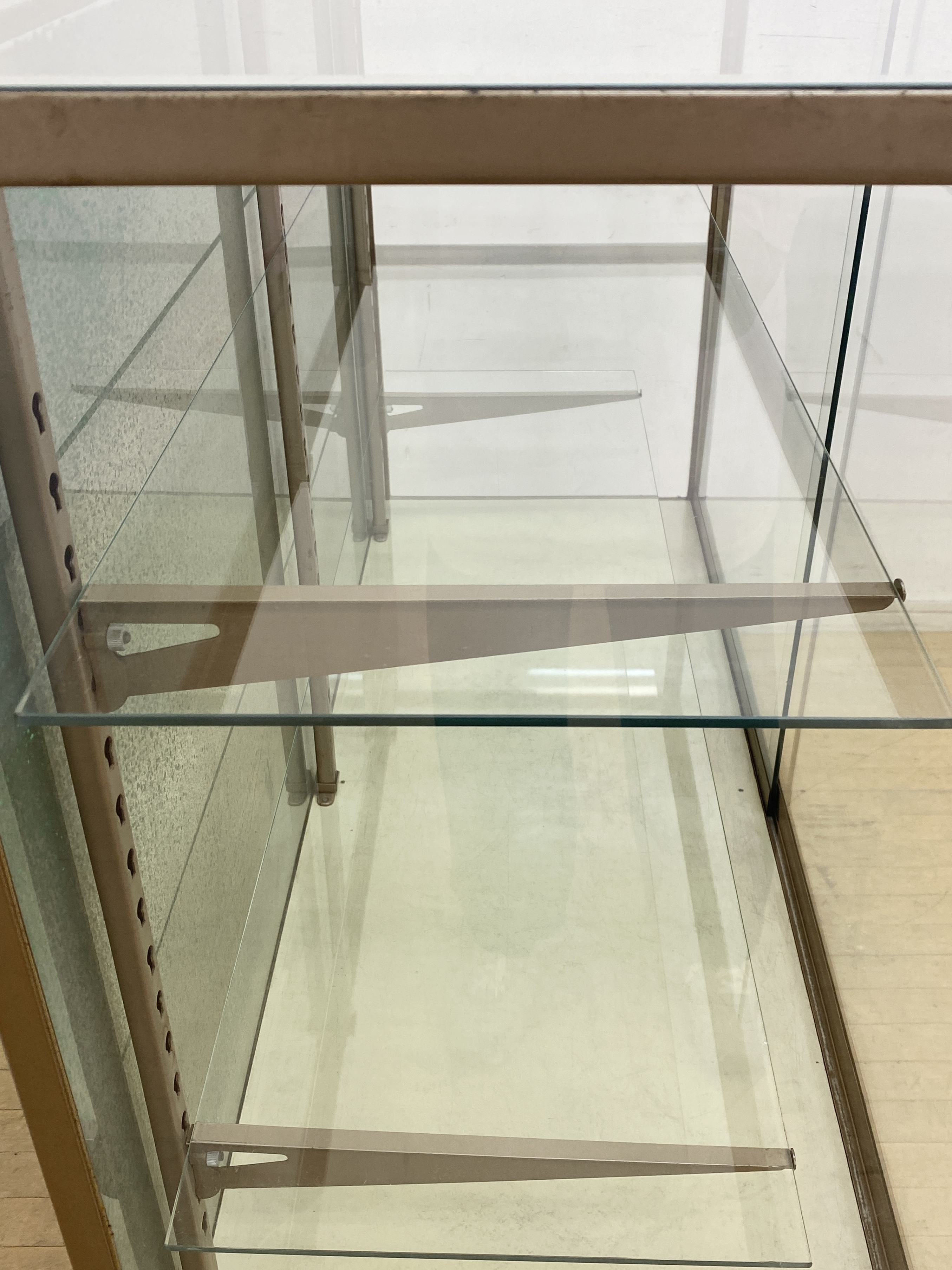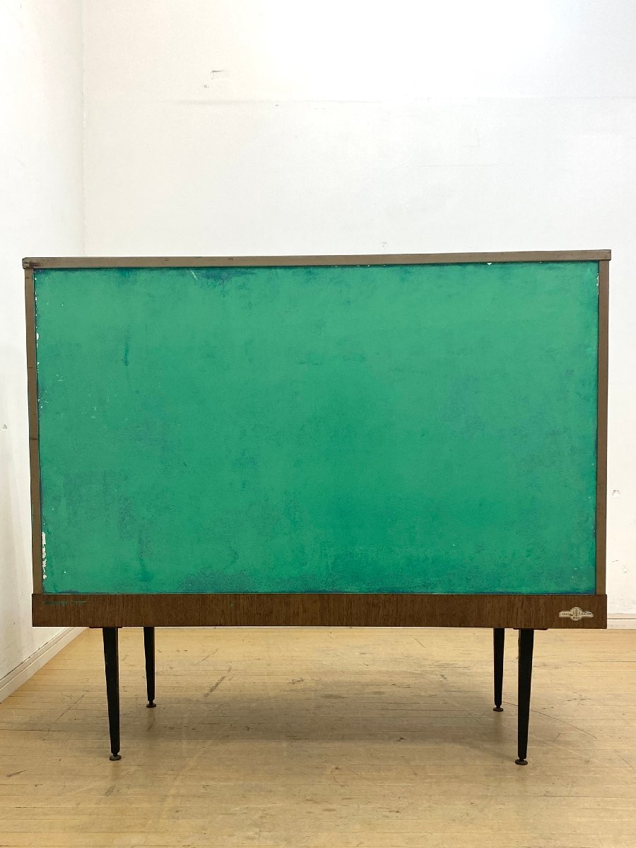 こちらはビンテージ ガラスショーケースです。 中古品です。 年代物の4面ガラスのショーケースです。 落ち着いた木地色の、すっきりとした印象のガラスケースです。 ガラスに囲まれたスペースはコレクションを引き立て幅広いディスプレイが可能です。 器やオブジェなどを飾ったり、店舗の什器としてもおすすめです。 内部はガラスの棚板が2枚付属します。高さを変えることができるため、展示内容に合わせて調整可能です。 背面は印象的なグリーンで塗装されています。壁付けだけでなく空間の仕切りとしてもおすすめです。 同型のガラスショーケースも出品中です。レトロな店舗什器としていかがでしょうか。 こちらも併せてぜひご検討ください。 【コンディションについて】 古いお品のため経年による木塗装剥がれやサビ、キズなどありますが扉の開閉はスムーズです。 ガラス面は擦れキズが全体に見られますが、透明感があり綺麗にディスプレイしていただけます。 また、欠けなどありますがご使用には問題のない程度です。底面にはキズや変色などの使用感があります。 使い込まれて程よく古びた風合いが素朴で優しい雰囲気を演出してくれるショーケースです。 他詳細については下記画像も併せてご参照ください。 ![]() 【天板】 ![]() 【左:扉 右:棚板】 ![]() 【ケース内側】 ![]() 【ケース内側】 ![]() この機会に是非ご検討ください。皆様のご入札をお待ちしております! 再良市場の他のお品物はこちらから!