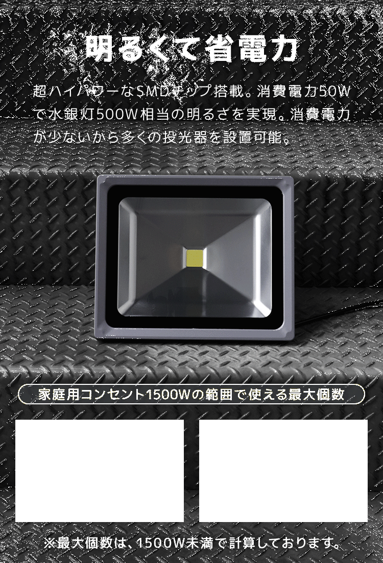 \ 安心の1年保証付き / 超高輝度SMDチップ搭載!明るくて省エネなLED投光器です。 投光器に適した台形リフレクターを採用し、ムラなく均一に照射します。 当製品は寿命が短くなる原因である「熱」を逃しやすくし、長寿命化を実現しました! またIP65規格の防塵・防水性能で、雨天でも使えます。 180度回転する取り付けステーには本体固定用の穴があり、壁や天井など様々な場所に設置できます。 爽やかでスッキリとした光で、色や文字がくっきり読みやすく、作業時に最適な点灯色です。 ■商品コード:A42D ■商品仕様 6個セット LED発光色:昼光色(6000K) サイズ:(約)28.5cm×23.5cm×12cm 重量:(約)2.0kg ルーメン:4300LM 照射角:120度 入力電圧:AC85~265V 50/60Hz 防水規格:IP65 材質:アルミ合金、強化ガラス コードの長さ:(約)3.0m(プラグ付・スイッチ無) ■注意事項 ・DC電源を使用しないでください。 ・完全防水ではありません。台風などの強い風雨で使用すると、浸水するおそれがあります。ご注意ください。 ・光源を直視しないでください。目を痛める場合があります。 ・LEDドライバーユニットが後部に納められていますが、 固定されていない為振るとカタカタと音がする場合ありますので ご了承願います。(不良ではありません) ・商品は、モニターによって色合いが異なって見える場合があります。 ・仕様・デザインは改良のため予告なく変更することがあります。 ■保障期間 1年間 【新品未使用品です】 |