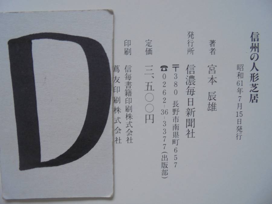(D)信濃毎日新聞社刊の「信州の人形芝居」で、縦26㎝、横幅19㎝、厚さ1.5㎝程度あります。