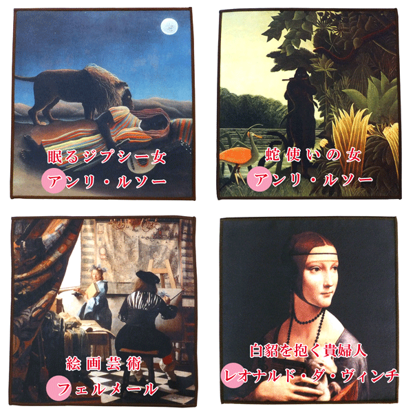 | 柄種 | ご希望の柄をお選びください。 モナリザ/ダヴィンチ 接吻/クリムト ムーランドギャレット/ルノワール 真珠の耳飾りの少女/フェルメール 黄道十二宮/ミュシャ 自由の女神/ドラクロア ヴィーナスの誕生/ボッティチェリ ひまわり/ゴッホ バラ図譜/ルドゥーテ 踊りの花形/ドガ シヴェルニーの睡蓮/モネ 睡蓮/モネ 最後の晩餐/ダヴィンチ 夢想/ミュシャ リンゴとオレンジ/セザンヌ 叫び/ムンク 牛乳を注ぐ女/フェルメール ベツレヘムの調査/ブリューゲル グランド・ジャット島/スーラ 羽根と桜草/ミュシャ 眠るジプシー女/ルソー 蛇使いの女/ルソー 絵画芸術/フェルメール 白貂を抱く貴婦人/ダヴィンチ |