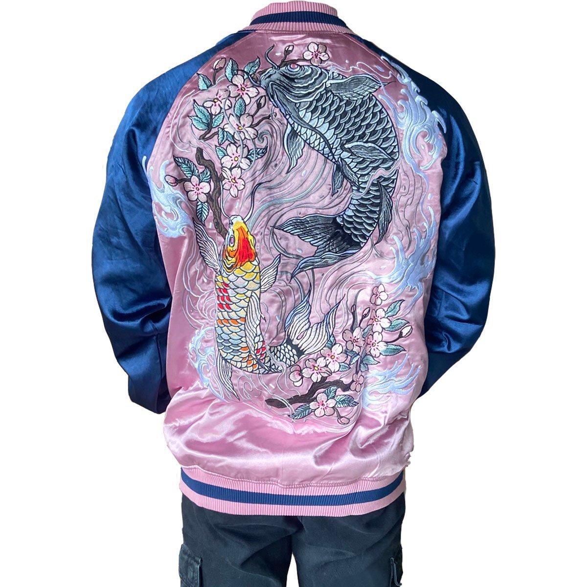 【C00251-2】未使用 M 刺繍 スカジャン ピンク 桃色 鯉 錦鯉 コイ 和柄 スーベニアジャケット サテン