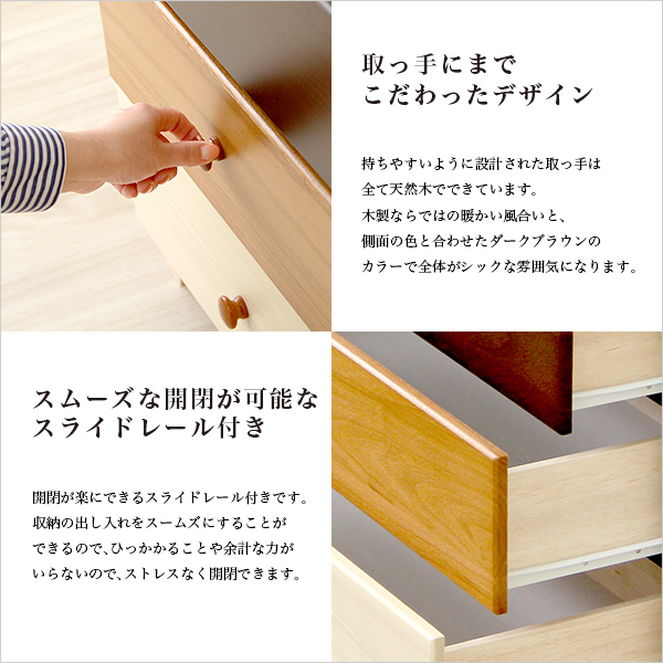 | 【ポイント】 ①美しい天然木を使用したチェストです。 ②スライドレールで楽々取り出し♪ ③届いてすぐ使える完成品です。 ④生産国は安心の日本製です。 ⑤シリーズで揃えればお部屋を明るくしてくれます。 |