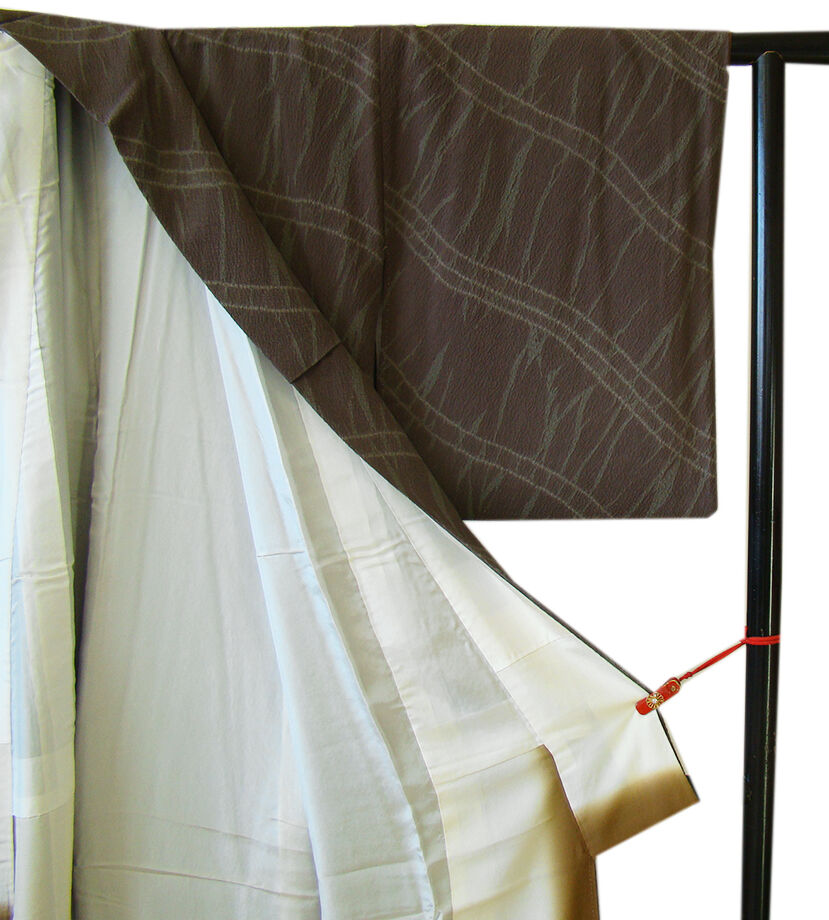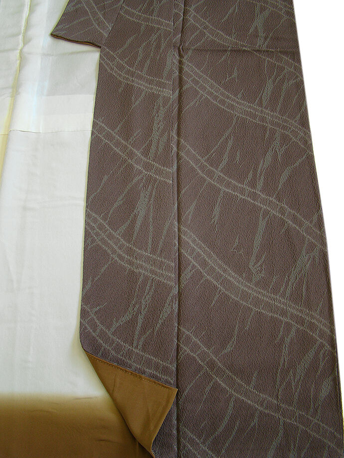 | 商品説明 | こちらのお品は「袷」ですので10月から5月までお召頂ければと思います。 とてもしなやかな手触りの着心地良い重めのぽってりとした極上ちりめん地の変り織の生地、 渋い紫鼠色地に鼠色の染柄、 八掛は路考茶色(正絹)、幅広い年代の方にお召頂けます。  |