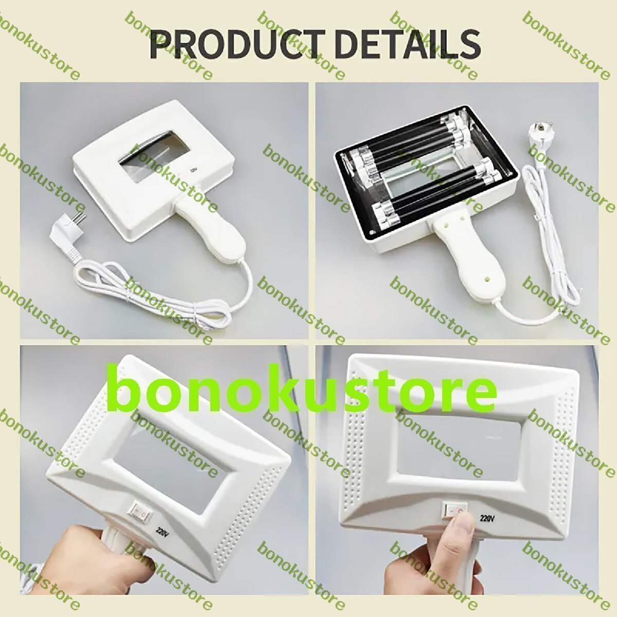 商品説明 商品の説明 商品情報: 製品名: ウッズライトスキンアナライザー 製品材質:ABS 電源電圧:220V 電源周波数: 50(HZ) 供給電流: 0.35A 製品重量:1.3kg 波長は約365nm パッケージサイズ: 30*21*8 センチメートル/11.8*8.2*3.1 インチ パッケージリスト: ウッズラン商商品情報: 製品名: ウッズライトスキンアナライザー 製品材質:ABS 電源電圧:220V 電源周波数: 50(HZ) 供給電流: 0.35A 製品重量:1.3kg 波長は約365nm パッケージサイズ: 30*21*8 センチメートル/11.8*8.2*3.1 インチ パッケージリスト: ウッズランプ*1 遮光布*1 マニュアル*1 使い方? 1. 肌を清潔にした後、コットンでお客様の目を覆います。 2. カバーシェードを木製ランプに固定します。 3. カバーシェードでお客様の顔を完全に覆います。木製ランプはクライアントの顔と平行で、距離は 5 ~ 6 cm でなければなりません。 4. 紫外線の下で異なる色の外観によって異なる皮膚の特性を識別します。