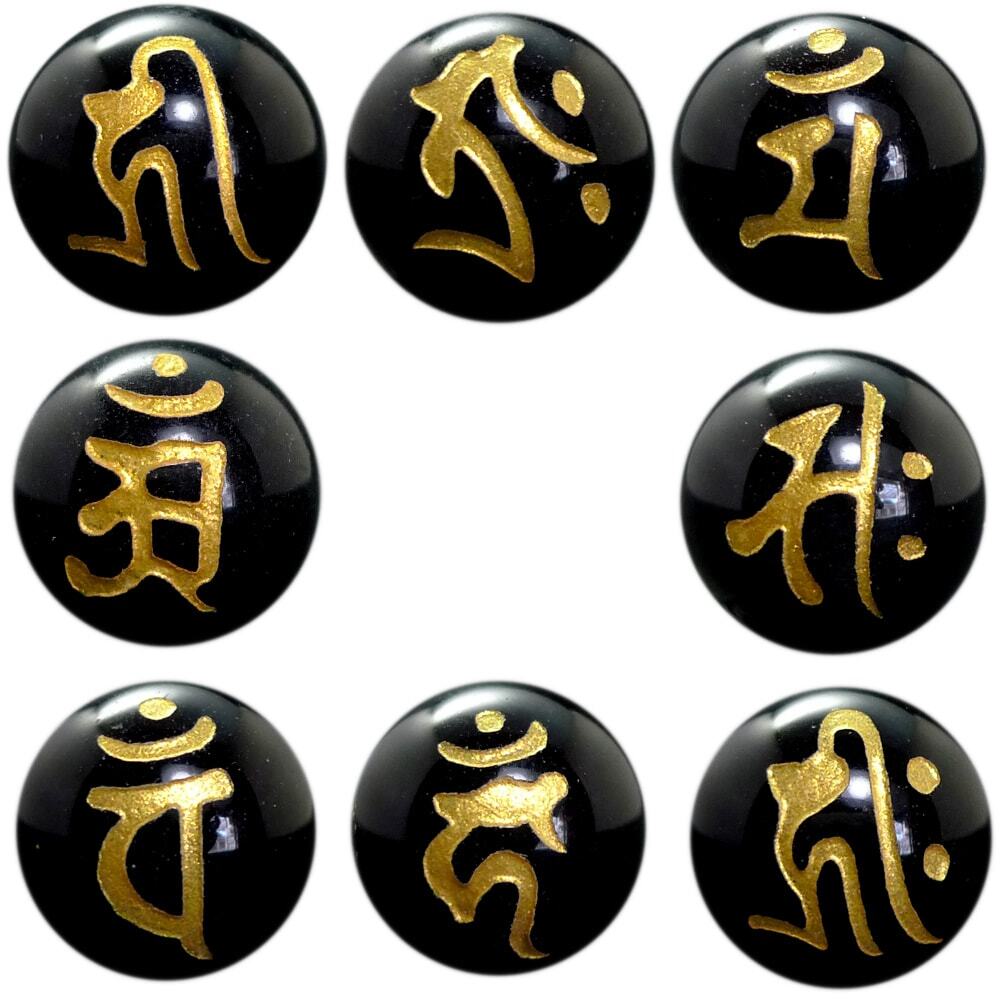 | title:『8玉セット 横穴』 梵字 彫刻 オニキス 14mm 金色 パワーストーン バラ売り ビーズ 玉売り ゴールド 天然石 粒売り /over |
